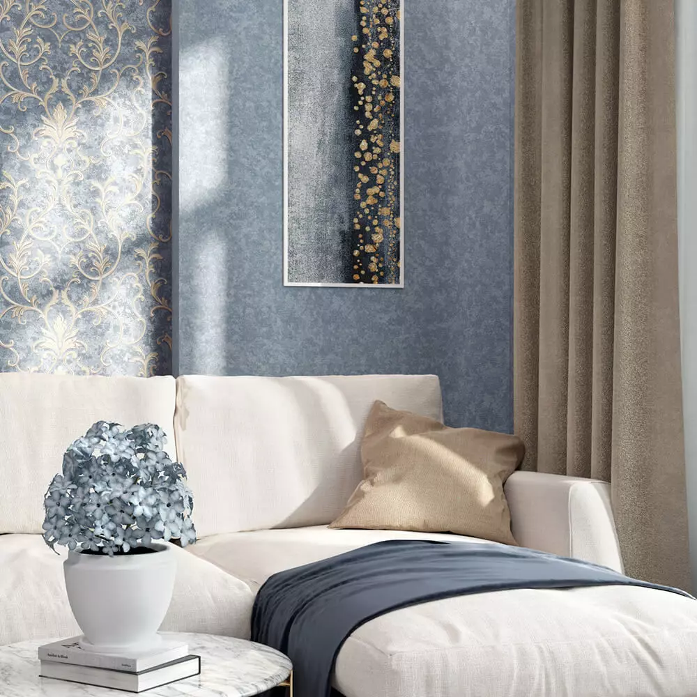 This versatile wallpaper features a soft mineral‑wash texture in a balanced steel‑blue tone, adding calm depth and contemporary character to living rooms, bedrooms, and workspace visuals. The surface blends matte grain with gentle sheen specks, creating a stone‑like effect that photographs cleanly under daylight and warm ambient lighting without glare or noise. Included are two high‑resolution JPGs: a styled room scene showing the solid paired with a coordinating gold‑scroll accent panel for realistic scale and palette harmony, plus a macro close‑up revealing the layered texture for swatches and tight crops. Use the macro for material boards, packaging, and overlay backgrounds, and use the room image as a ready hero backdrop for sofas, textiles, and décor product staging with ample negative space for headlines. The cool‑neutral palette grades smoothly—adjust warmth, contrast, or saturation to match brand guidelines while preserving highlight detail across the mineral grain for web and print. Ideal for CGTrader previews, catalog covers, Pinterest creatives, and archviz plates where relaxed luxury and modern classic styling are desired. Delivered as high‑quality JPGs optimized for cropping to square, 4:5, or 16:9 layouts across platforms and ads.