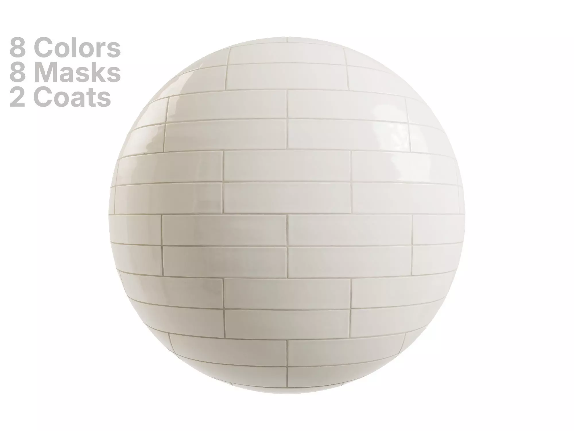 The package includes 8 diffuse variations with matching grout tones, and a flexible color base that works out-of-the-box or as a starting point for custom looks.