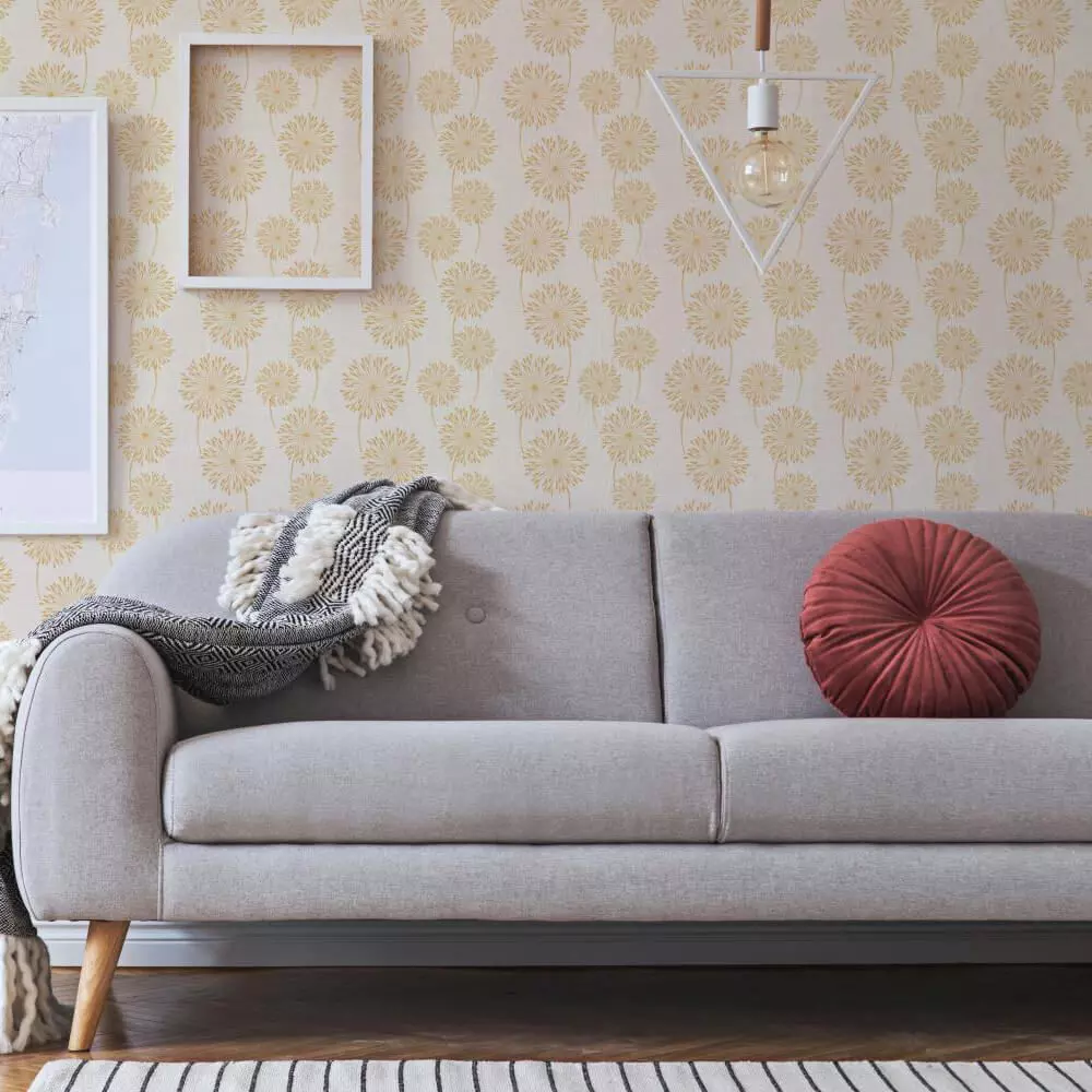 OverviewA cheerful mid‑century inspired wallpaper texture featuring repeating dandelion sunbursts in warm mustard on a creamy ground. A tactile grid‑crinkle substrate adds hand‑printed charm while keeping the palette light and versatile for living rooms, dining corners, studios, and playful retail interiors. The seamless pattern ensures clean tiling across large walls.