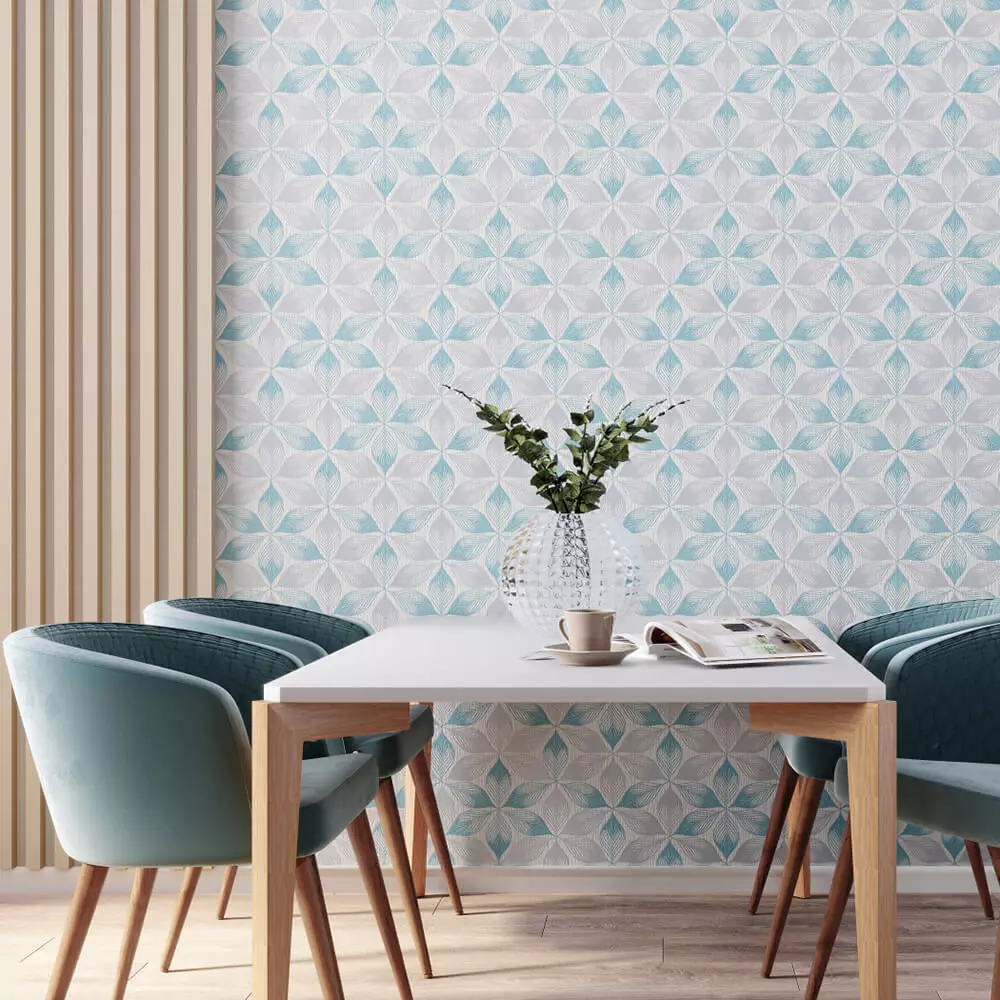 Bring modern elegance to interiors with a seamless teal and silver geometric leaf wallpaper pattern, ideal for archviz, product staging, and branding backdrops on any render engine. The pack includes a lossless seamless tile (4K), PBR maps for realistic light response, and a clean studio mockup showcasing the pattern in a dining nook with soft natural lighting and wood accents. The motif features petal-like leaves arranged in a repeating star geometry on a warm off‑white base, balancing minimalism with subtle metallic sheen for premium looks. Perfect for walls, panels, and UV‑tiled sets; optimized scaling ensures crisp repeats without visible seams. Commercial use is allowed for renders and scenes; do not resell the texture “as-is.” Files: PNG/JPG seamless tile, Normal/Roughness/Metallic (if applicable), preview renders, and usage notes.
