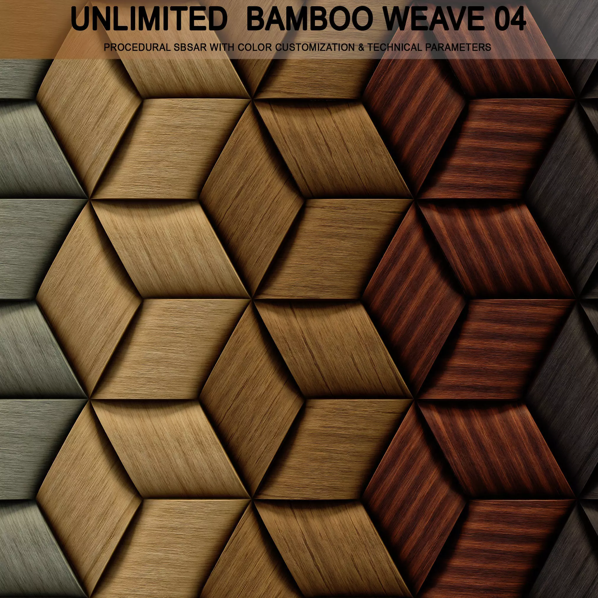 Unlimited Bamboo Weave 04-01 is a fully procedural SBSAR material featuring a high-quality diagonal bamboo weave pattern. Designed for real-time environments, architectural visualization, and product rendering, this smart material offers extensive color customization and full technical control over surface and roughness details.