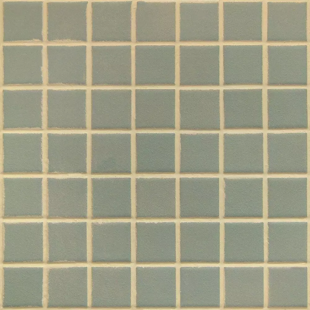 Seamless small square mosaic tile material in a desaturated vintage blue with warm sandy grout and subtle edge wear for aged realism.