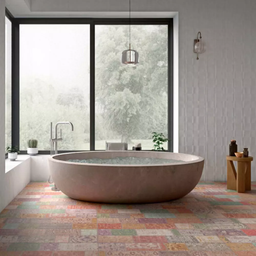 A vibrant patchwork of distressed oriental rug motifs arranged in stitched panels brings eclectic, hand‑loomed character to modern bathrooms, kitchens, cafes, and boho living spaces without overwhelming the room . Faded teal, coral, saffron, and plum blocks emulate time‑worn textiles while retaining crisp print clarity for large‑format panels and seamless tiling across broad surfaces . Perfect for floor or wall applications in CGI staging and decor mockups, the artwork scales cleanly and maintains woven‑fiber texture for a convincingly tactile finish, as shown in the lifestyle preview with spa tub setting .
