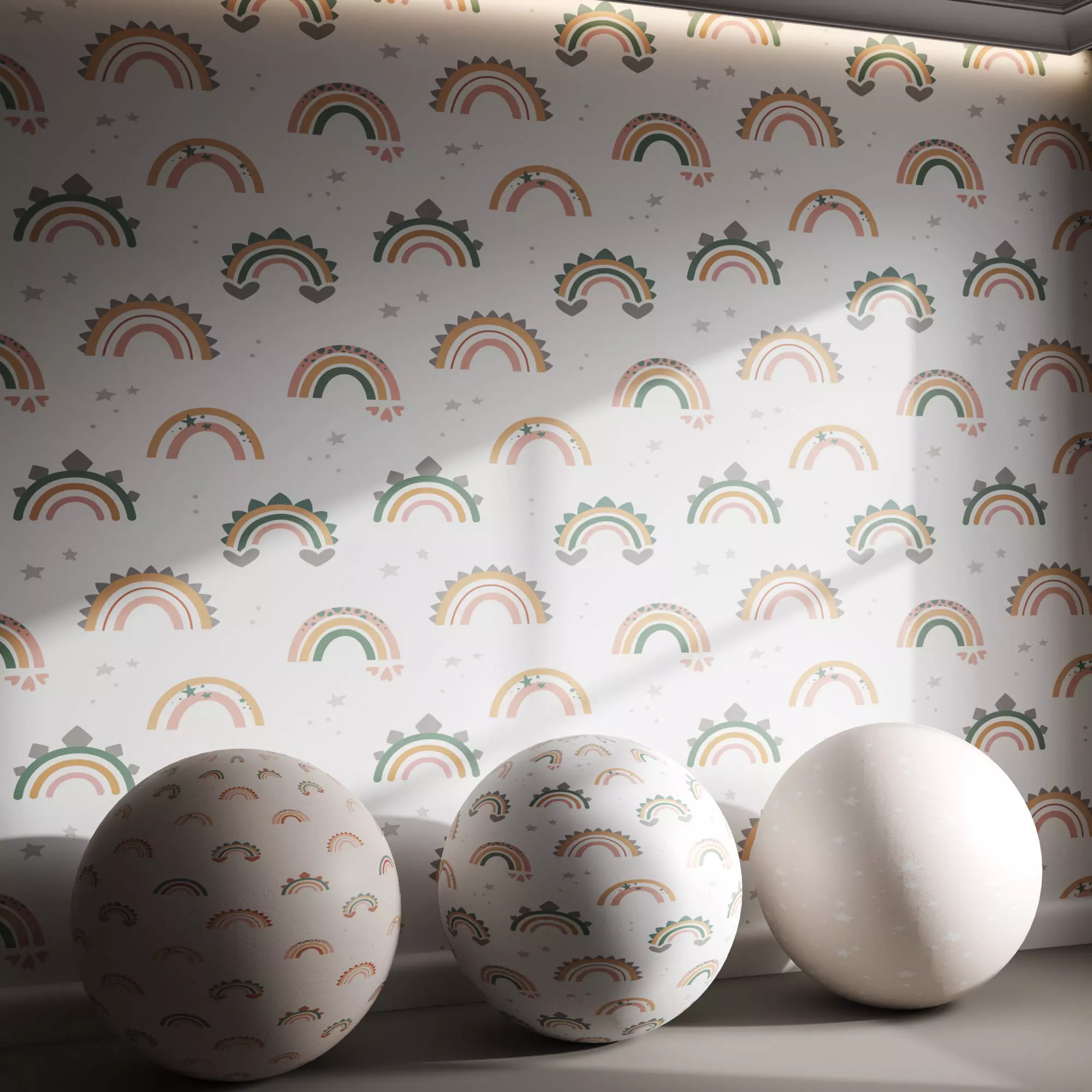 Tags:pastel wallpaper, kids room wallpaper, rainbow pattern, star wallpaper, whimsical decor, baby nursery wallpaper, soft color wallpaper, scandinavian kids design, boho baby room, celestial wallpaper, minimal kids decor, rainbow mural, cozy kids interior, gender neutral wallpaper, cute wall texture, pastel kids wall, interior design wallpaper, 3D wall model, cartoon rainbow, toddler room decor