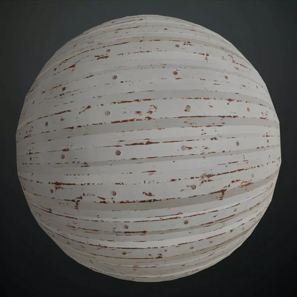 This is a high-quality PBR Texture Pack of a White Steel Container surface. All essential Maps, including BaseColor, Normal, Roughness, Height, and Metallic, are provided to deliver a highly realistic and industrial finish. This material features the iconic horizontal corrugated ribbing found on standard shipping containers, coated in a stark industrial white paint. The surface is detailed with significant environmental wear, featuring extensive horizontal rust streaks, paint chipping, and oxidized rivets that reveal the underlying weathered metal. This texture is an exceptional choice for shipyard environments, logistics hubs, modular housing units, or heavy-duty industrial storage assets that require a realistic, aged appearance.