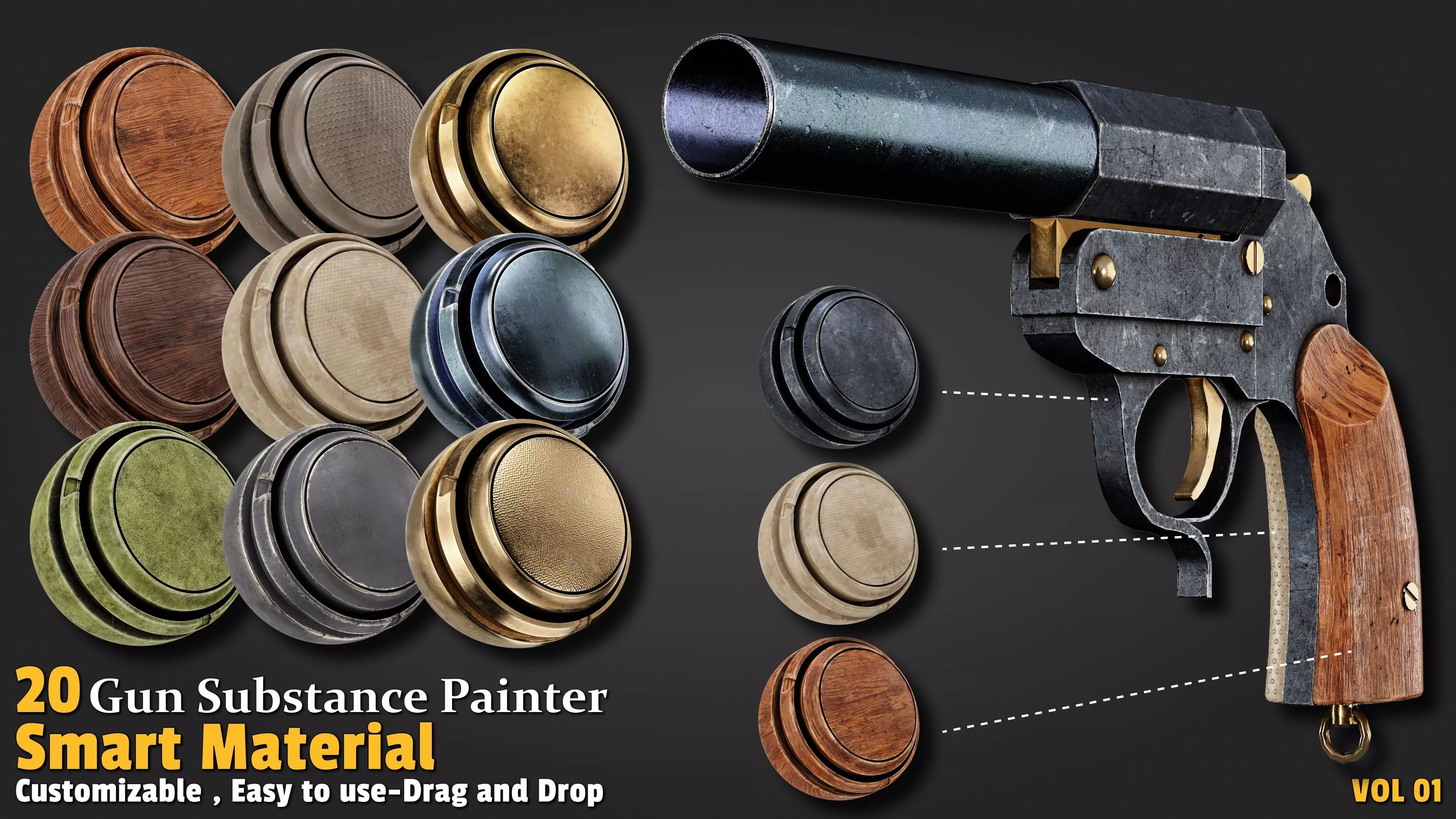 This pack includes 20 professional Gun Smart Materials created in Substance Painter version 11. It features 5 Wood materials, 5 Metal materials, 5 Gold Metal materials, and 5 Plastic materials. All are in SPSM format with high-quality previews and fully Drag & Drop ready.