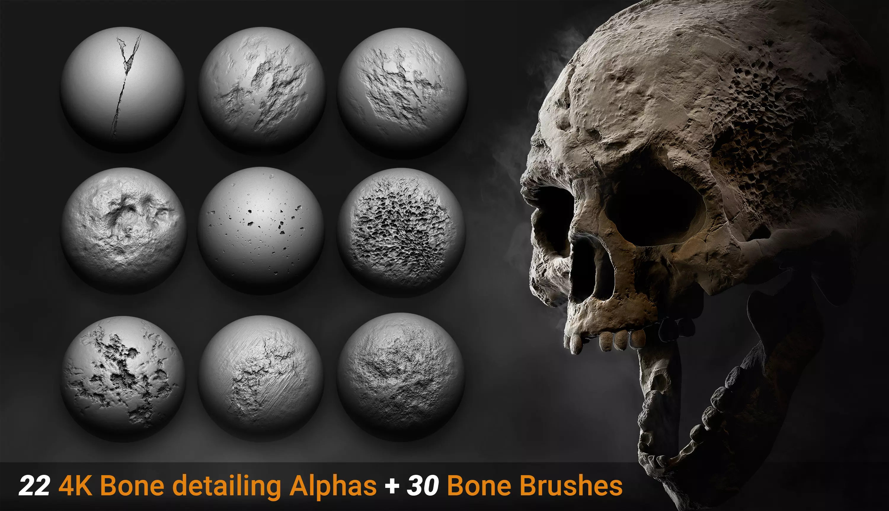 Here are 22 4K bone detailing alphas for any modeling/texturing software, but also 30 brushes for Zbrush and Blender.