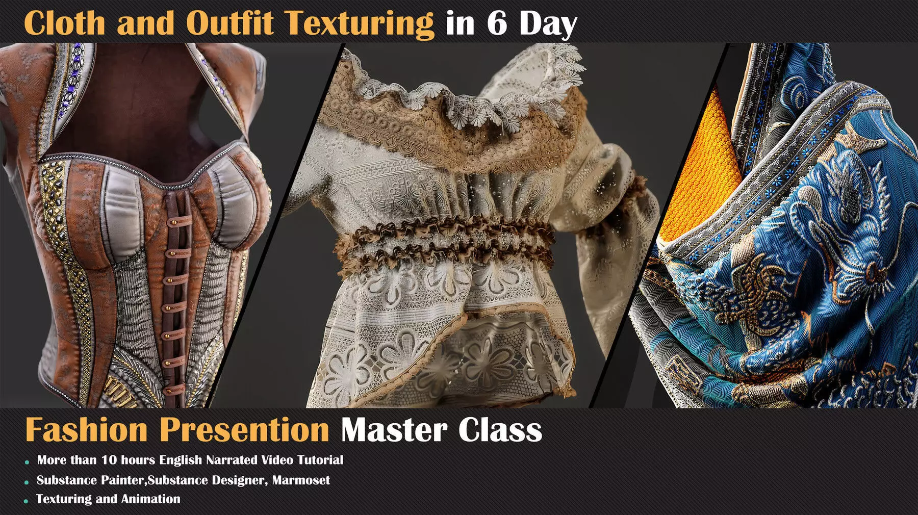 End strong with distressed fabrics — frayed edges, ripped threads, and aged surfaces. Then light, animate, and showcase your work in Marmoset Toolbag like a true pro.