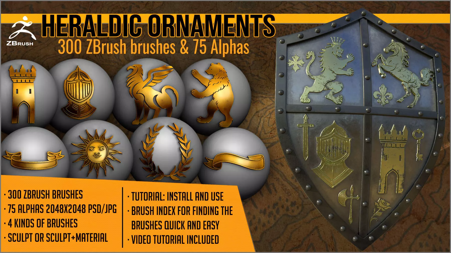 Heraldic Ornaments Maker is a set of 300 ZBrush brushes and 75 alphas for adding heraldic ornaments on armors, warrior props, fantasy models, shields, swords, axes and other weapons, helmets, medieval and knight props, architecture, and any other model that you can imagine.Good ornaments can take your models to an upper level.