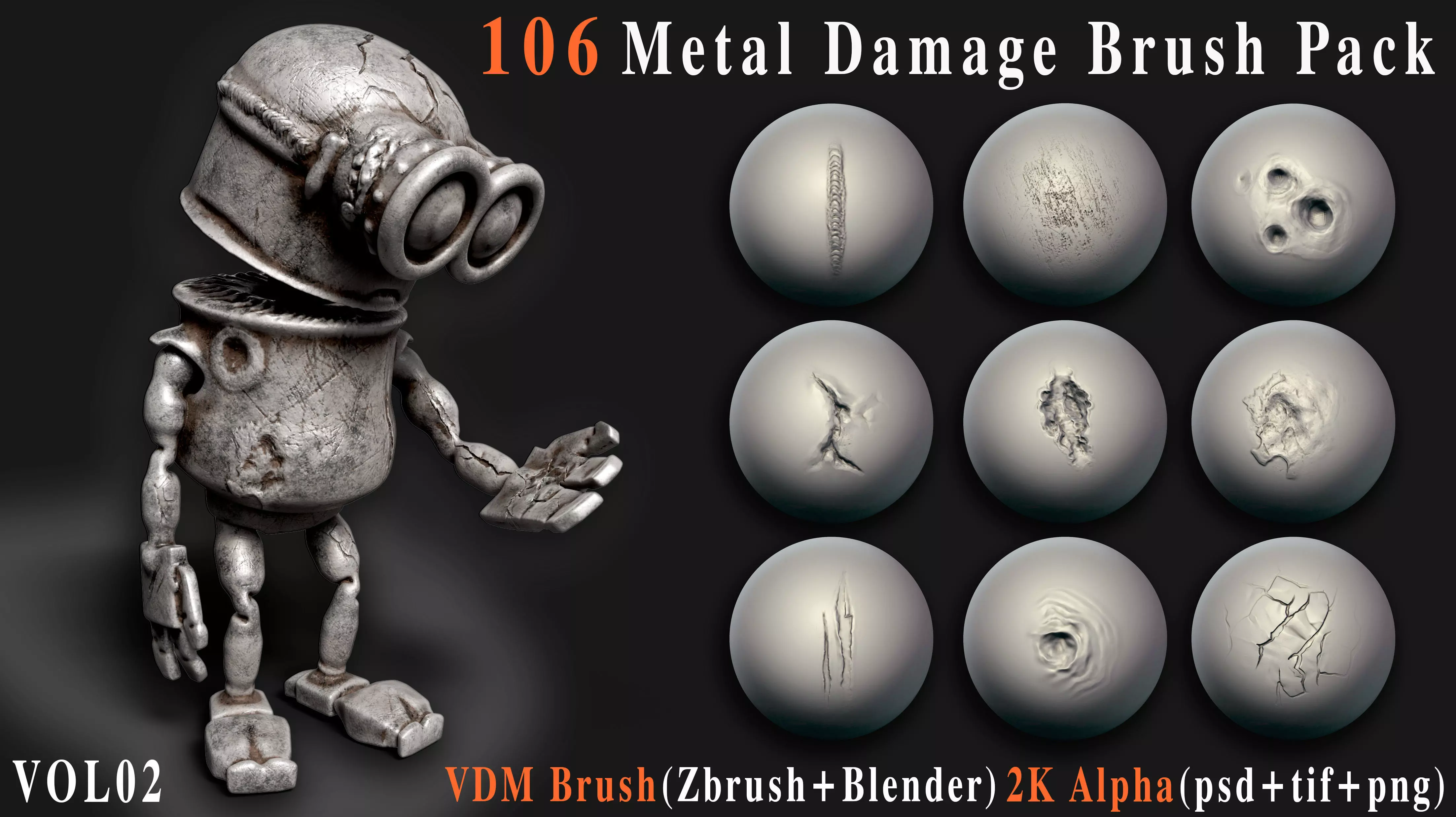 Bring realism and bold character to your metal surfaces with this premium collection of 106 high-quality brushes. Designed specifically for sculpting damage, wear, and industrial imperfections, this pack is ideal for weapon artists, hard-surface sculptors, and game environment creators.Includes both VDM brushes for ZBrush + Blender and 2K alphas (PSD, TIFF, PNG) for universal use.