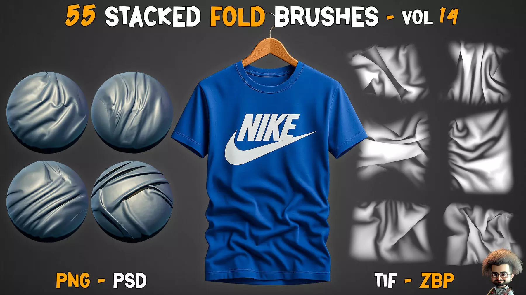 50 Cloth Wrinkles Brush – Vol 0960 Fold & Compression Brush – Vol 0650 Cloth Wrinkles Brush – Vol 0570 Cloth Tension & Compression Brush– Vol 04100 Leather Fold & Tension – Vol 0360 Cloth Tension Brush - Vol 0180 Cloth Wrinkles & Folds Brush - Zbrush & Substance Painter - Vol 0150 Cloth Wrinkles Brush – Vol 0850 Fold & Wrinkkle + Alpha & VDMs Brush - Vol 1255 Tension & Stretch Wrinkle Brushes – Vol 13Stencil: