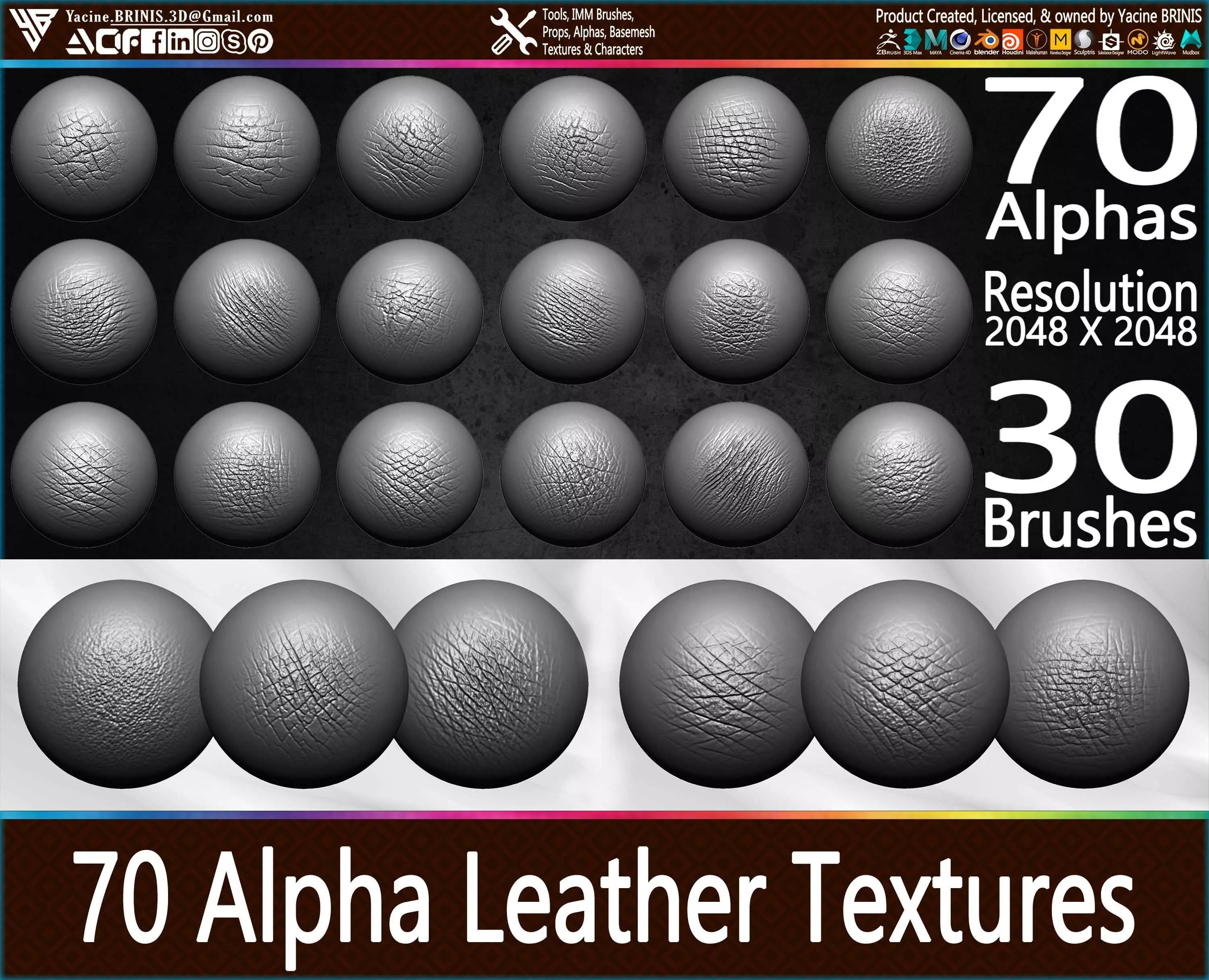 -70 Alpha Leather Textures JPEG files-70 Alpha Leather Textures Bitmap files-70 Alpha Leather Textures Photoshop files-70 Alpha Leather Textures FITT files-30 Leather Brushes for ZBrush