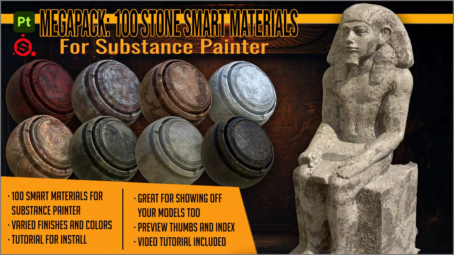 Get this megapack of 100 Stone Smart Materials for Substance Painter, in many colors and finishes, prepared for drag and drop on your model. They are ready to look good on most lights, providing you with the look you need for your works.