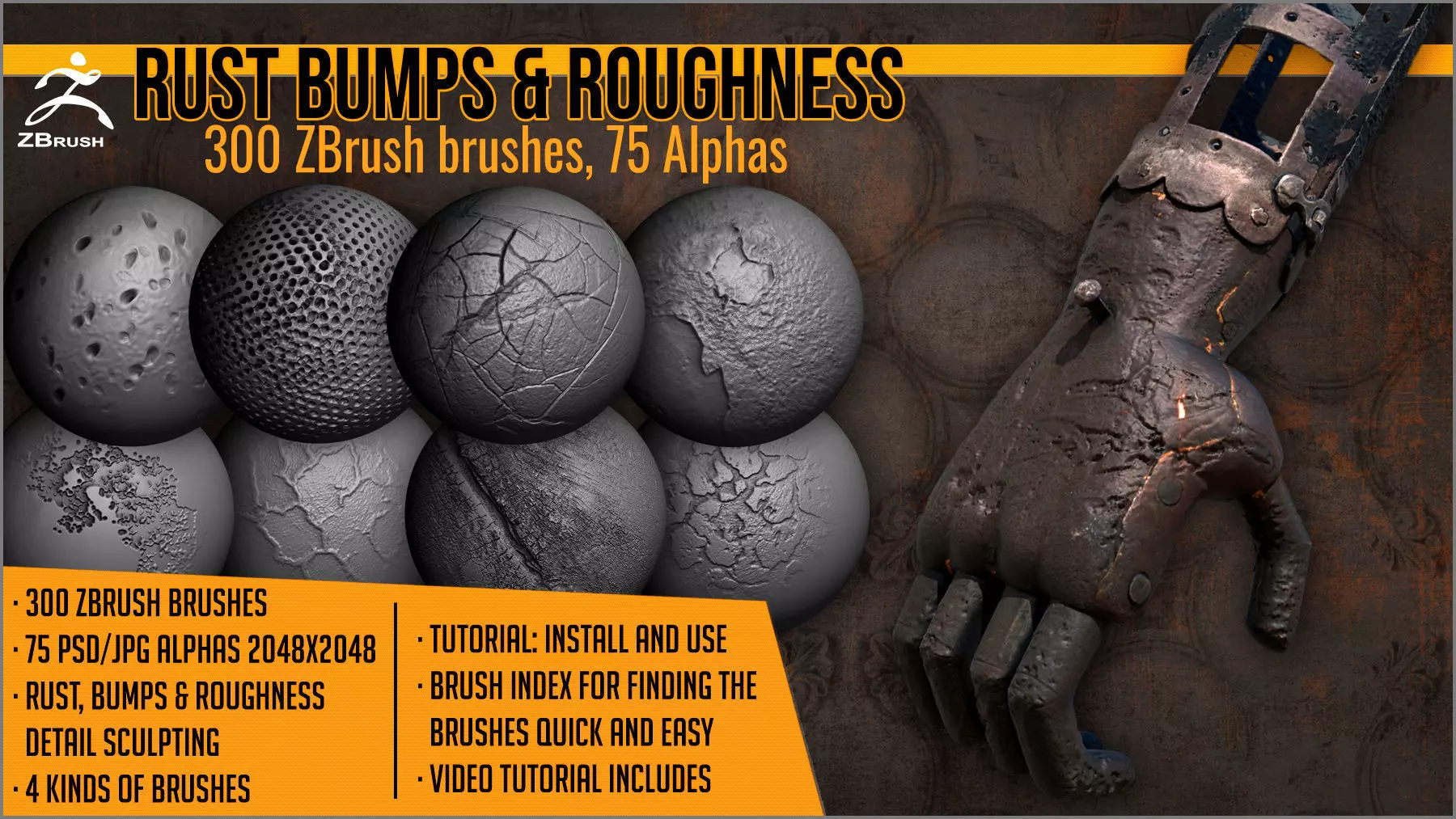 - *300 ZBrush brushes *(75 DragRect, 75 DragDot, 75 Draw, and 75 Spray) for sculpting rust, bump and rough surface details.