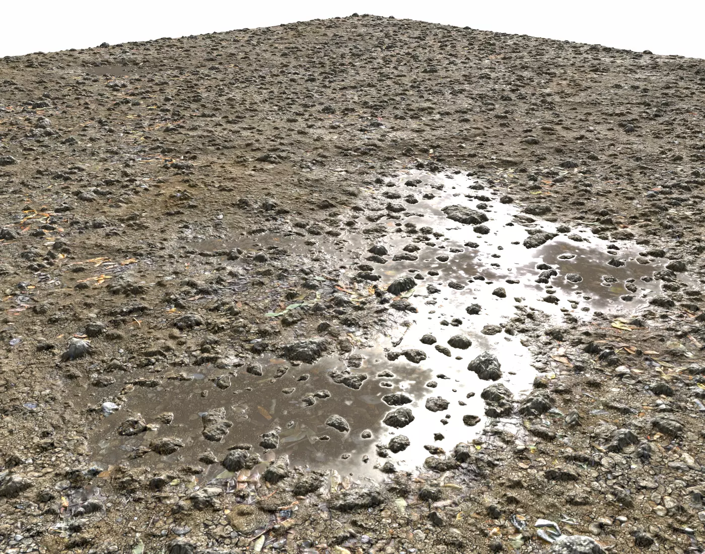 Rough terrain texture with rocks, puddles and leaves, suitable for forest, mountain, etc..., consisting in 4 texture sets containing: