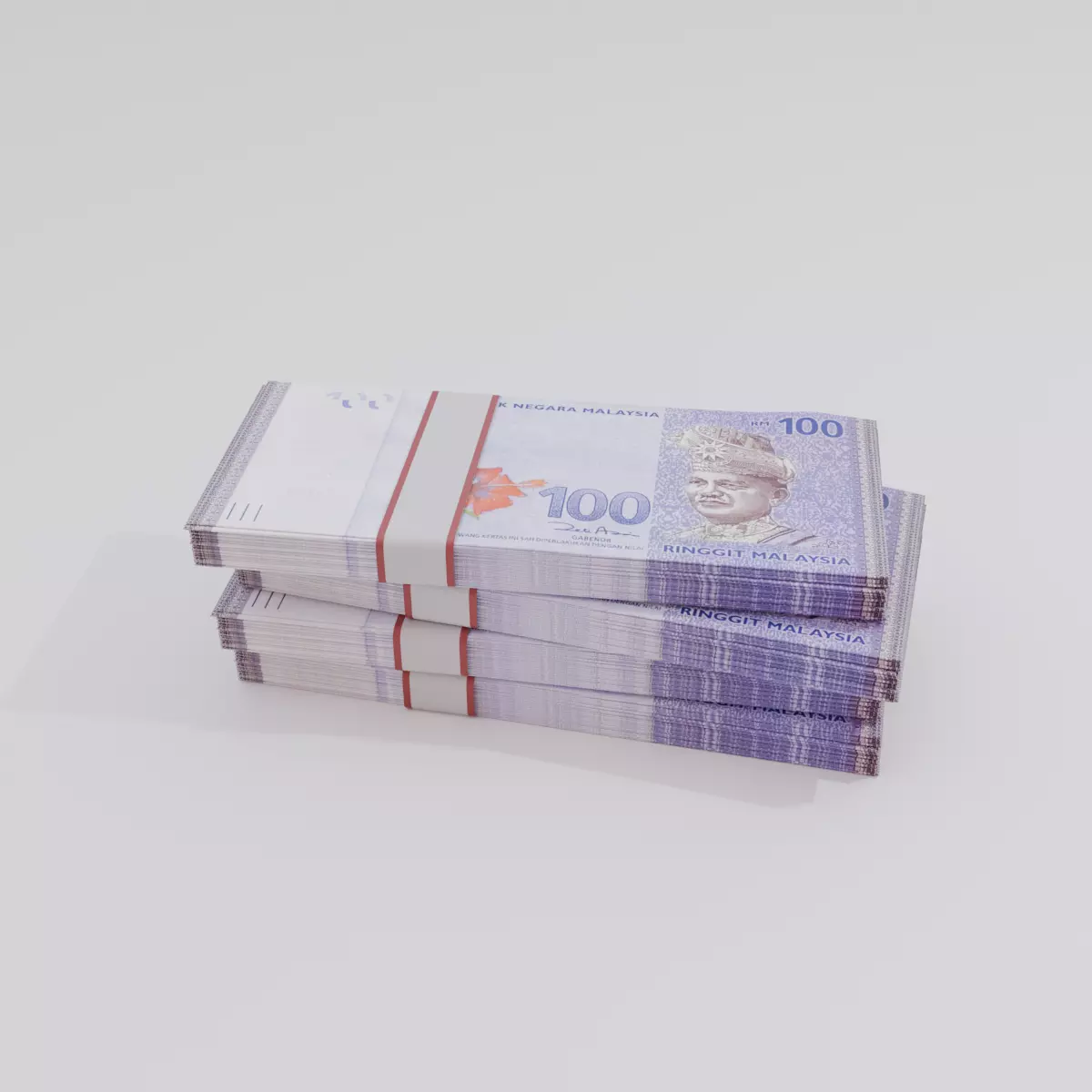 This high-quality 3D model depicts the 100 Malaysian Ringgit (MYR) banknote with authentic design details, including the royal purple color scheme, intricate Malaysian motifs, and security features. Ideal for use in finance-related visualizations, educational content, AR/VR environments, and digital asset packs.
