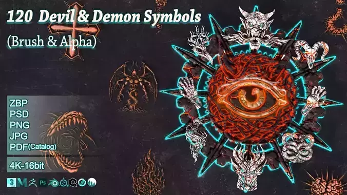 - A high-quality collection of 120 handcrafted demonic and occult symbols, designed for artists who want to add dark, mystical, and supernatural details to their work. This pack delivers clean, sharp, production-ready alphas ideal for ZBrush detailing, texture creation, concept art, VFX, game assets, and UI design.- All files are provided in 4K resolution, 16-bit, ensuring crisp, high-fidelity results in any workflow.- What’s Inside- 120 Alphas & Brushes- Formats: ZBP, PSD, PNG, JPG- Resolution: 4096×4096 (4K)- Bit-Depth: 16-bit for maximum detail- PDF Catalog for fast browsing and preview- Key Features- Ultra-clean, high-resolution symbols- Perfect for creating engraving, tattoos, UI glyphs, armor markings, demonic runes, magic seals, ornaments, and stylized details- Suitable for both realistic and stylized projects- Works seamlessly with: ZBrush, Substance Painter, Photoshop, Blender, 3ds Max, Maya, Cinema 4D, Unreal, Unity, and all software supporting alpha maps- Easy drag-and-drop workflow- Who Is This Pack For?- This pack is ideal for:- Character artists- Environment artists- Concept artists- Game developers- VFX designers- Illustrators- UI/UX artists working on dark-fantasy interfaces- Anyone creating dark, demonic, gothic, occult, fantasy, or horror-themed visuals- Perfect For- Armor engravings- Creature and demon markings- Magic circle FX- Tattoos and skin details- UI icons and glyphs- Stylized props- Ritual symbols- Environment carvings- Fantasy and horror illustrations