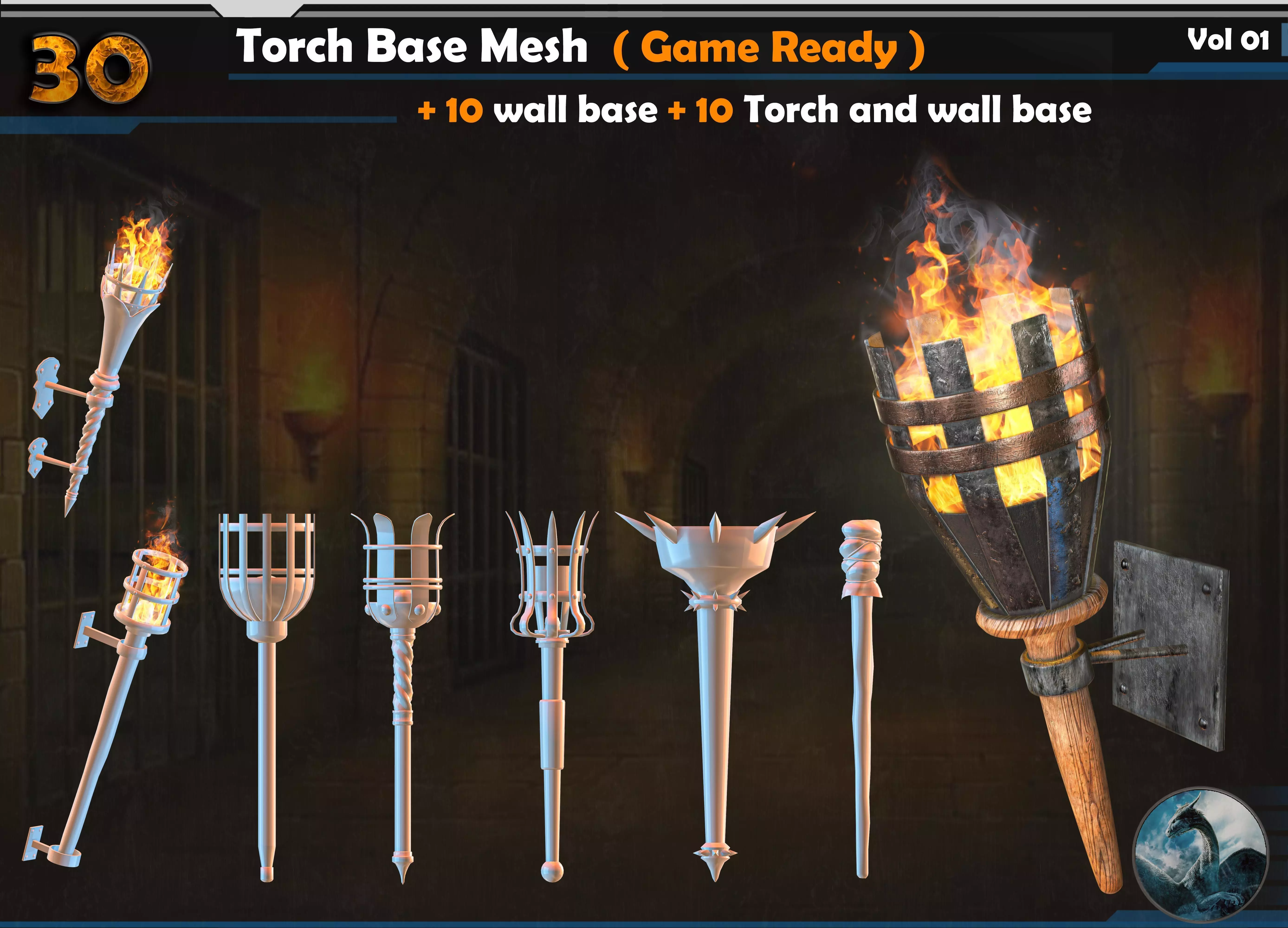 This Product include 30 Torch Base Mesh (Game Ready) + 10 wall base + 10 Torch and wall base