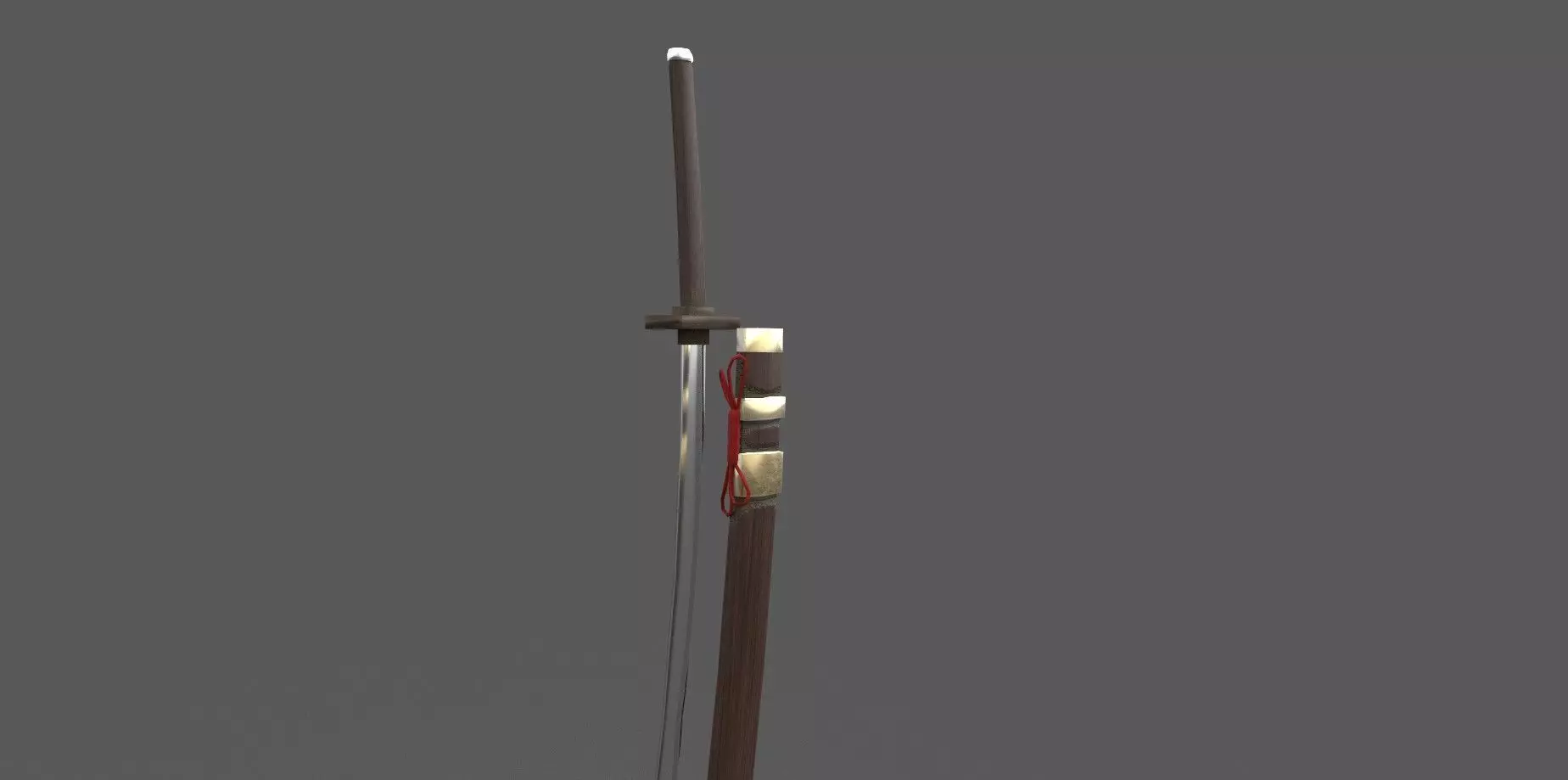 A sleek, curved blade with a detailed hamon pattern. The hilt features a traditional wrap for realism, and the ornate handguard adds elegance. Comes with a matching scabbard. Ideal for games, animations, and renders.