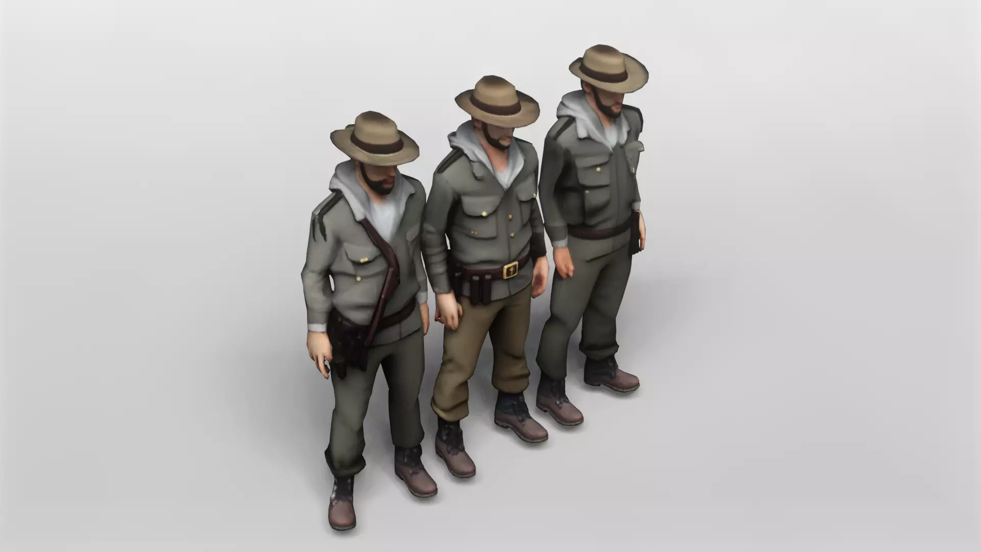 This highly detailed 3D model features a rugged adventurer man dressed in a casual military-inspired outfit. The character wears a wide-brimmed hat, a buttoned shirt with chest pockets, and matching pants tucked into sturdy boots. Accessories include a belt with pouches and a shoulder strap, adding to the model's realistic and practical look. The model is presented in three views: front, back, and side, showcasing the intricate details from all angles.The textures are meticulously crafted to highlight fabric folds, stitching, and material variations, giving the model a lifelike appearance. The color palette is muted and earthy, suitable for outdoor or exploration-themed projects. This model is ideal for use in games, animations, or virtual reality environments where a rugged, explorer-type character is needed.The model is available for download in GMB format, with the texture files included to ensure seamless integration into your projects. Additionally, it is offered in FBX format, providing compatibility with a wide range of 3D software and game engines. Both formats maintain the high level of detail and texture quality seen in the preview images.Whether you are creating a narrative-driven game, a cinematic animation, or a virtual experience, this adventurer model offers versatility and realism. Its detailed accessories and clothing make it a perfect asset for storytelling and immersive environments.