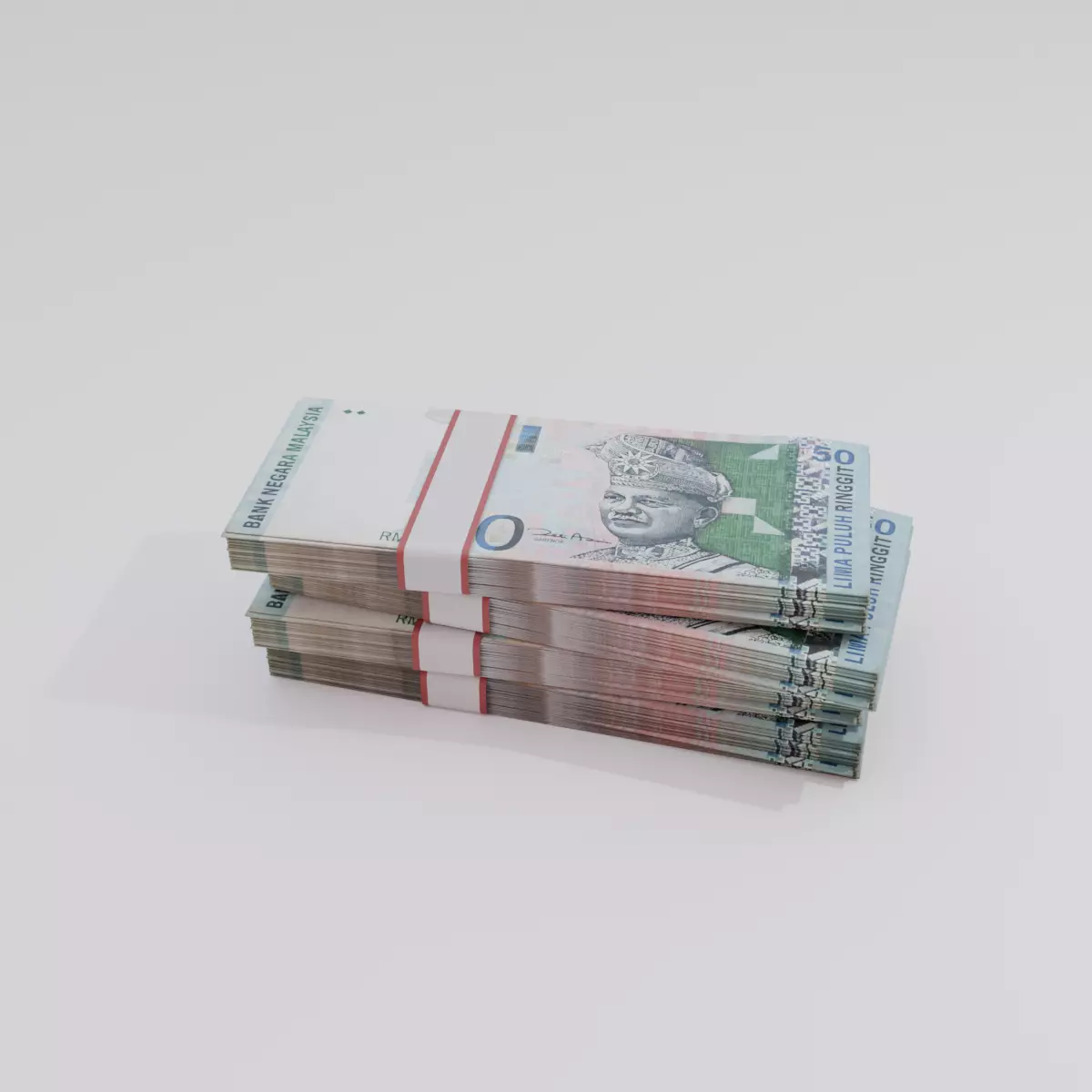 This 3D model features the 50 Malaysian Ringgit (MYR) banknote with photorealistic detailing, including vibrant blue-green hues, Malaysian national elements, and modern security design. It is suitable for financial visualizations, AR/VR applications, currency education, and 3D asset libraries.