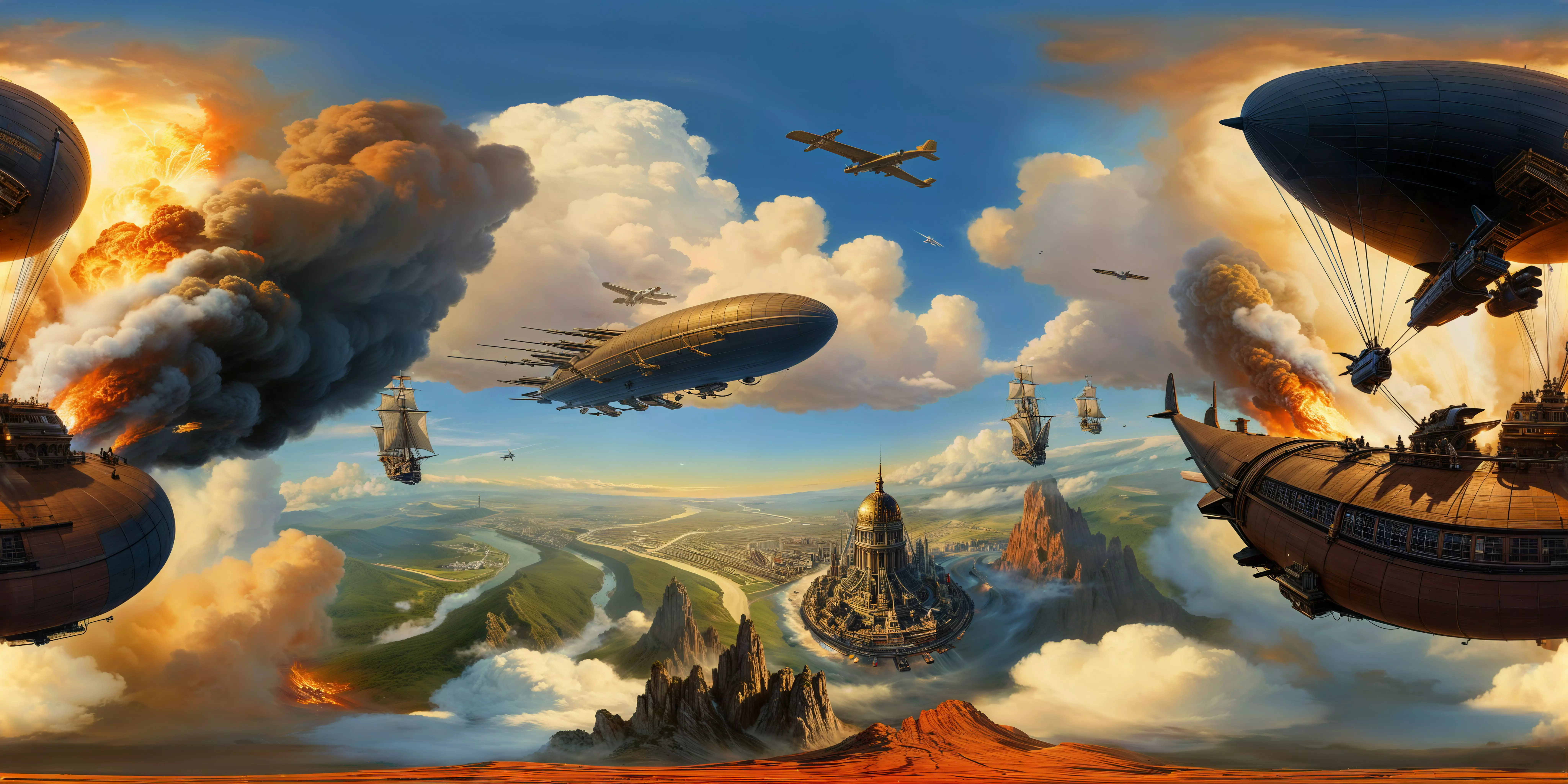 airships, pirates, battle, explosions, smoke, skies, combat, warfare, action, battle, atmosphere, skies, clash, aesthetic, fantasy, adventure, conflict, warfare, scene, action