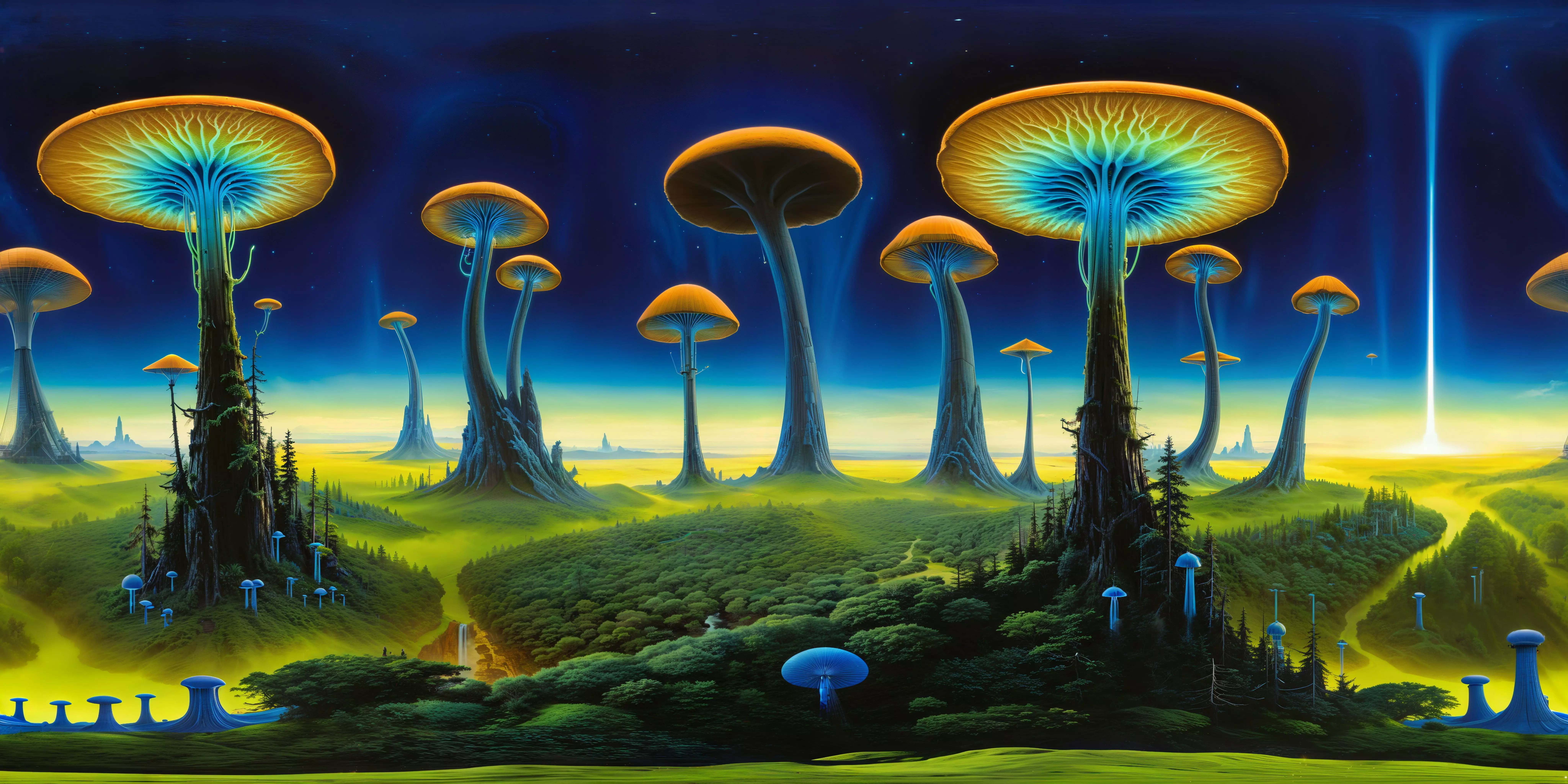 forest, fungi, light, air, nebula, landscape, nature, glow, forest, scene, environment, terrain, world, setting, fantasy, landscape, glow, terrain, sci-fi, atmosphere