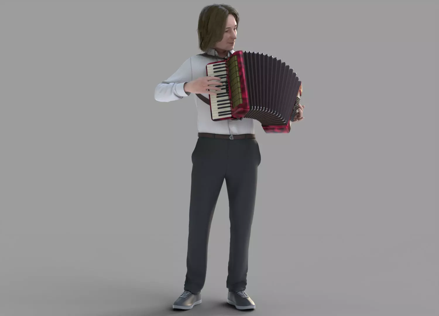 The accordion is perhaps the most folk musical instrument of the 20th century. Its distinctive, warm, and vibrant voice seems designed to accompany both joy and sadness, dancing and contemplation. Its sounds instantly transport one to the atmosphere of a joyful feast, boisterous celebrations, and heartfelt festivities. This instrument became an integral part of folk culture, from village weddings to city streets. It didn't require a stage or complex equipment—one person with an instrument was enough to lift the spirits of an entire group. Where the accordion sounds, a celebration lives. The accordionist is a welcome guest, not just a musician, but the soul of the occasion.They speak to the audience through music, selecting melodies that resonate with every heart. Often, they don't even need sheet music—everything they need is stored in their memory, played by ear, inspired by inspiration. They have gathered people around them, united generations, and instantly lifted spirits. Even today, despite the abundance of modern electronic music and gadgets, the accordion still evokes genuine emotions. Its sound takes us back to the past, reminding us of simple yet profound feelings, of timeless values—love, friendship, familiar songs, and the warmth of human connection.Low-poly 3D model created in Blender, optimal renderer Cycles. Detailed enough for close-up rendering. Comes with detailed textures. Texture resolution 4096x4096 jpg.WinRAR texture archive includes:• Bace color• Normal map• Metallicity• Occlusion• Roughness• OpacityHair – plates. The model is available in OBJ, FBX, Blender formats.