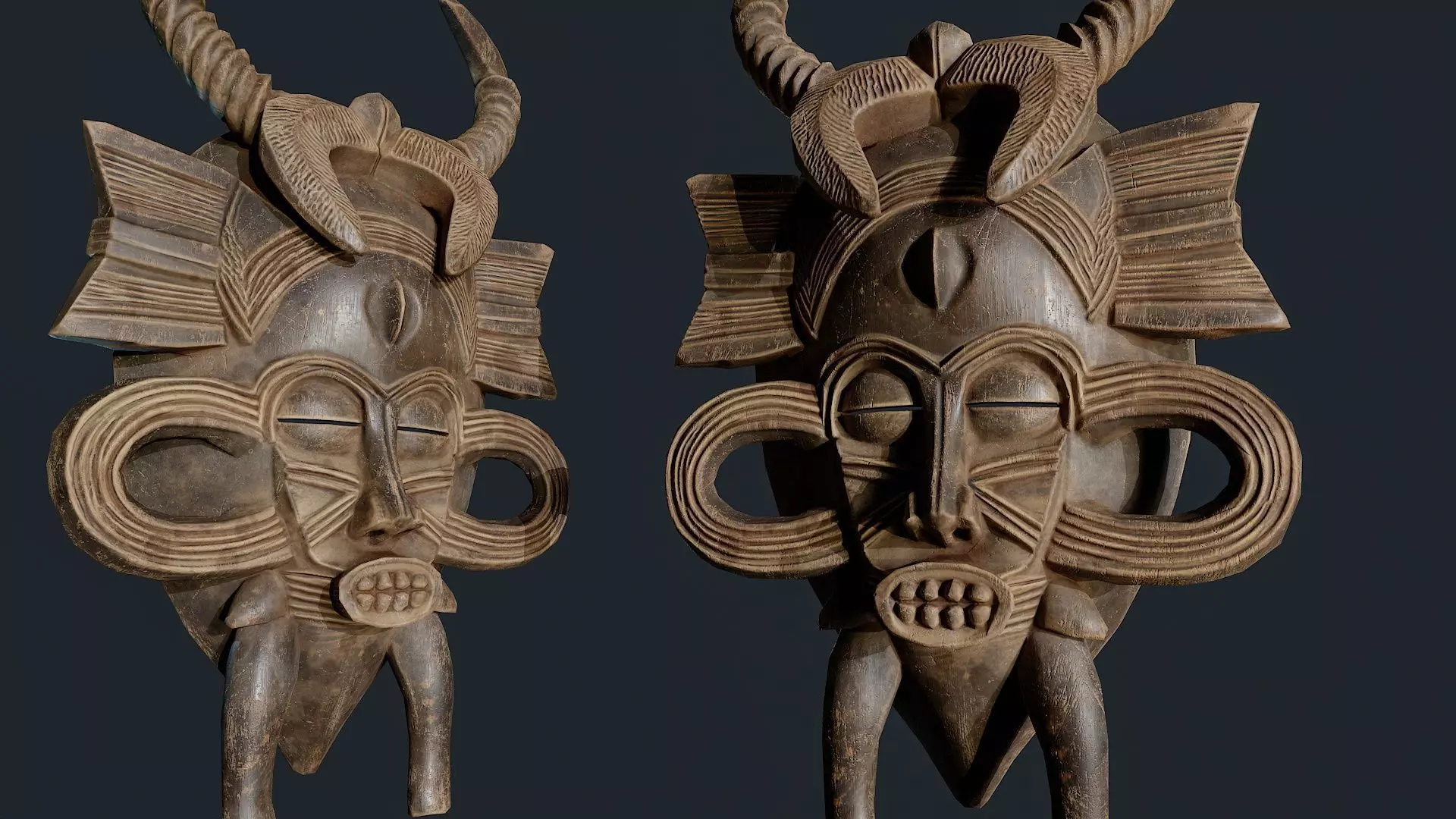 The mask imitates hand-carved wood and natural pigments, reflecting the rich culture and traditions of African art. It is perfect for use as African decor in interiors, visualizations, design projects, and games.