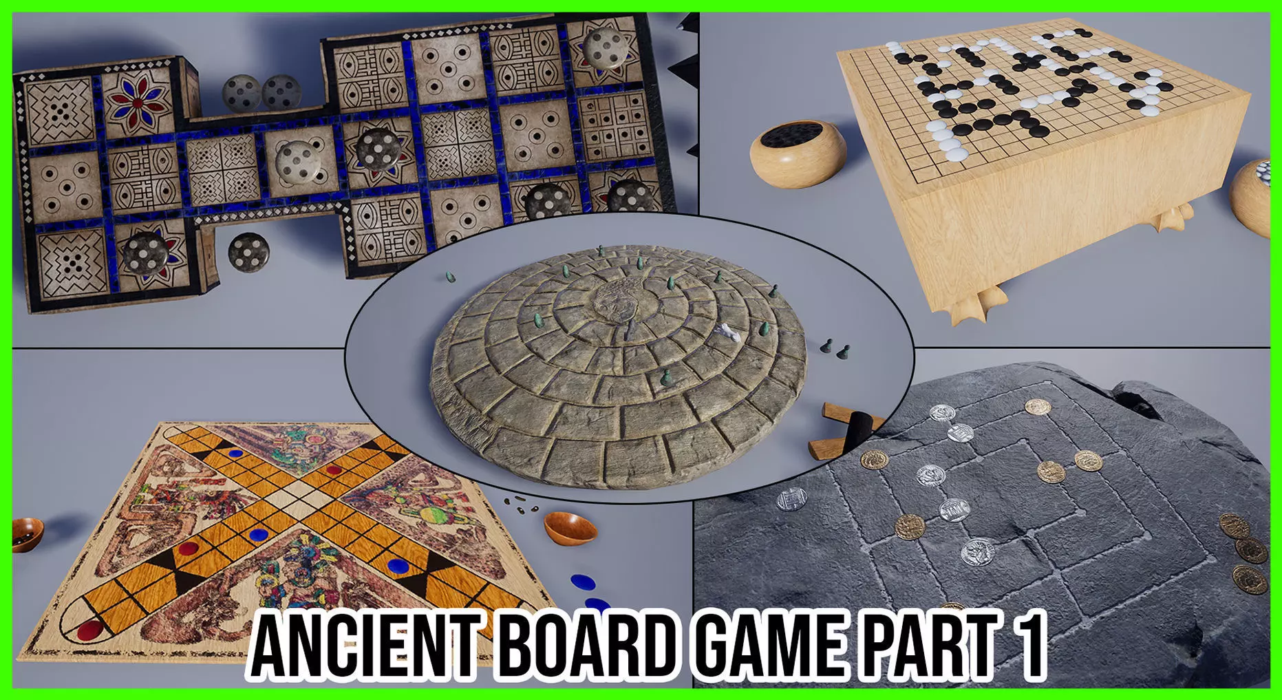 The pack contains 5 different board games from around the ancient world:
