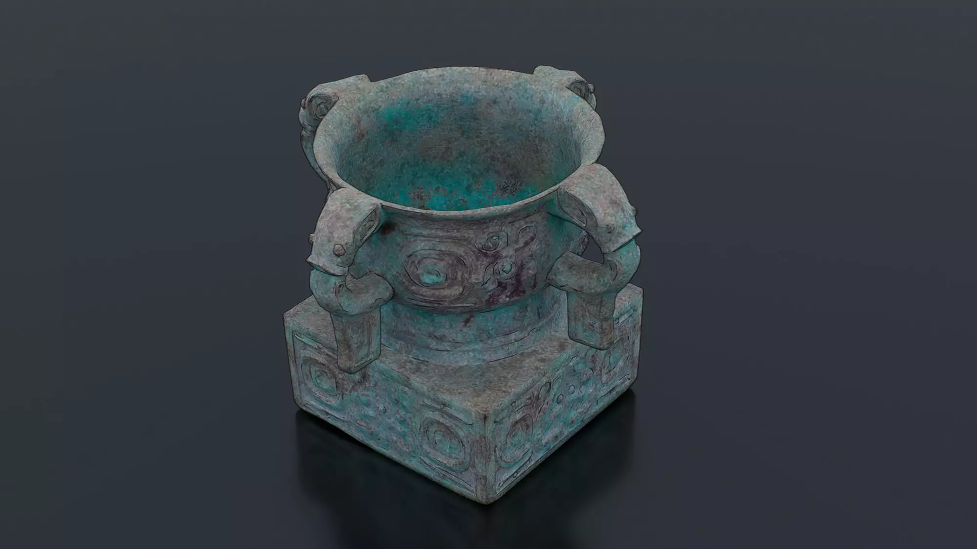 This low-poly 3D model recreates an ancient Chinese ritual bronze ding, drawing inspiration from Shang-Zhou dynasty designs. Serving as a ceremonial vessel, it features a verdigris patina finish, intricate zoomorphic ornaments on the body and ears, and rests on a square pedestal. Optimized for real-time applications like games or simulations, this model combines historical aesthetics with efficient topology.