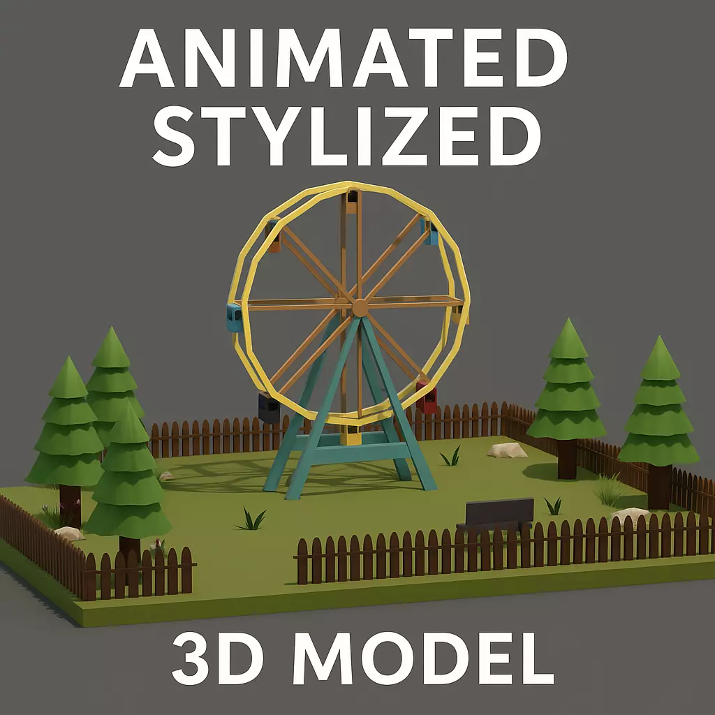 This is a fully modeled and animated stylized Ferris wheel scene, created in Autodesk 3ds Max 2024. The model features a rotating Ferris wheel placed inside a small fenced park environment with trees, benches, rocks, and grass elements. Designed with a clean low-poly aesthetic, this model is ideal for games, animations, or stylized visualizations.