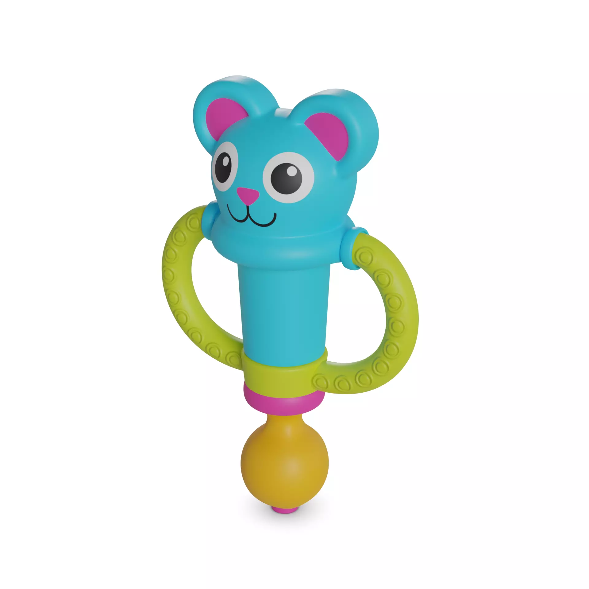 Baby Rattle: A cute and colorful baby rattle made of BPA-free plastic. The rattle is designed with a comfortable grip for little hands and features a variety of textured surfaces for sensory exploration. The packaging includes a clear plastic container with a vibrant label showcasing the rattle's features and benefits.