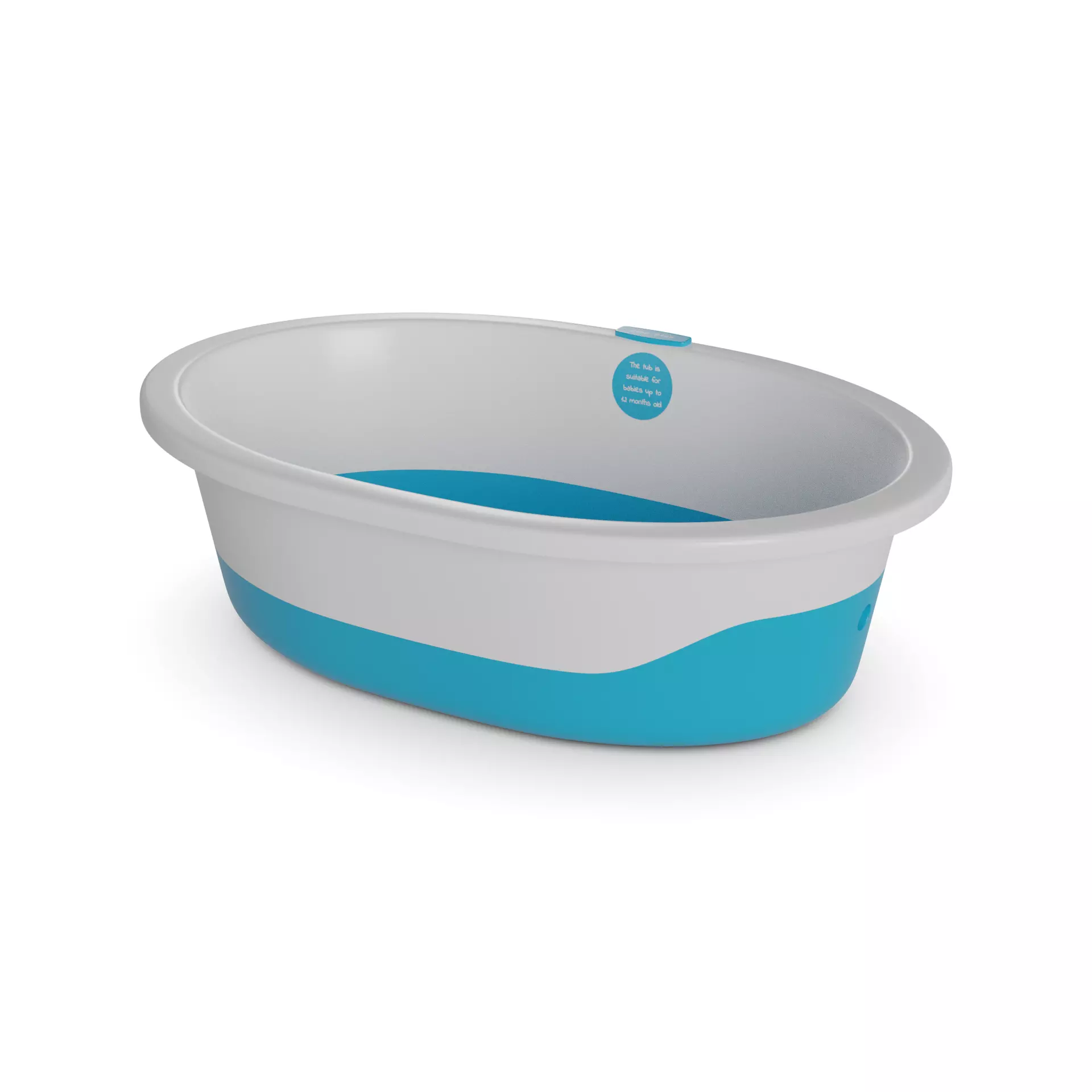 Baby Bath Tub: A colorful and sturdy baby bath tub in a compact size. The tub is made from durable plastic and features a non-slip bottom to ensure your baby's safety during bath time. It has a built-in soap dish and a drain plug for easy cleaning. The packaging includes a graphic illustration of a happy baby splashing in the tub and suggests text labels such as Safe and Fun Bathing Experience and Easy to Clean and Store. The tub is suitable for babies up to 12 months old.