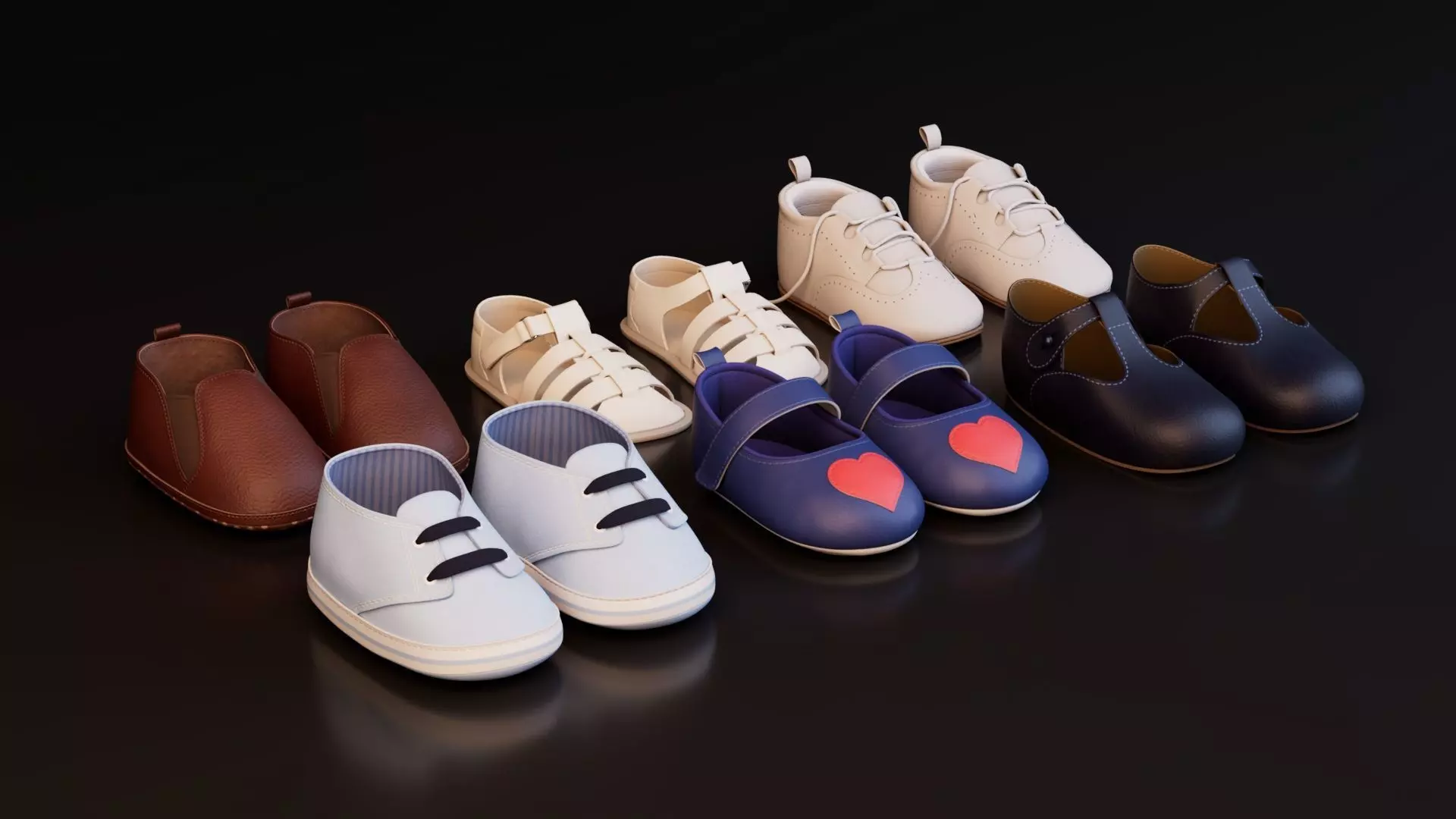 This Baby Shoes 3D Model Collection features six highly detailed and charming infant shoe designs, accurately modeled to reflect a variety of styles suitable for both everyday and formal babywear. Each shoe pair is designed with realistic proportions, clean topology, and high-quality PBR textures, making it ideal for product mockups, game props, animation projects, baby clothing visualizations, and nursery-themed renders.
