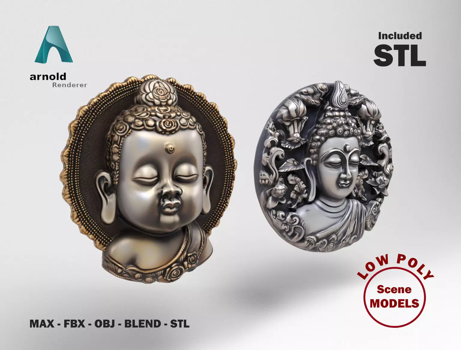 3D Models of Buddhas for decoration wall. All the models are low poly, basic but realistic and are ideal for 3D scenes that require few polygons. They can be used for advertising visualitations and also for games or applications. It has been created in different 3D Studio Max versions and also in FBX, OBJ, STL and blend.