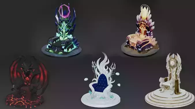 This is a premium pack of five high quality cartoon-style fantasy throne 3D models, each with a unique theme and design: