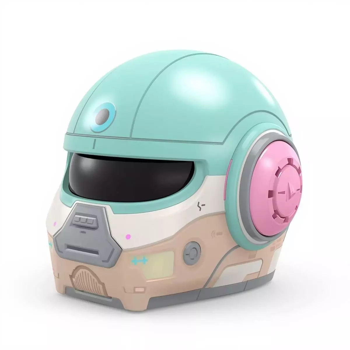 Tagshelmet, robot helmet, toy helmet, chibi style, soft sci-fi, pastel colors, mint green, pink, 3d model, game asset, futuristic