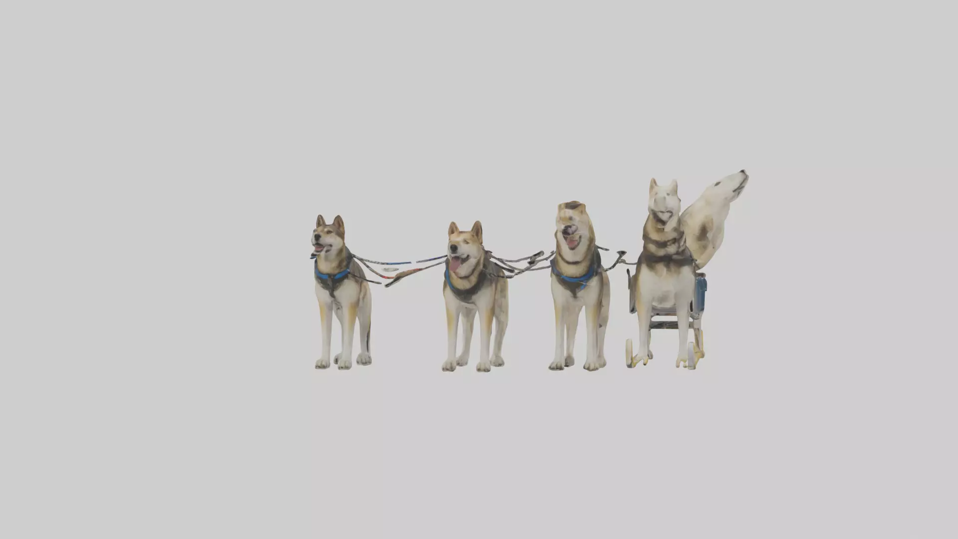 Concise 3D model of Chinook Dogs sledding. Depicts a team of Chinook dogs pulling a sled, possibly with a musher, in a snowy setting. Suitable for winter scenes and adventure visualizations. Available in FBX, OBJ, STL, GLB, USDZ, and BLEND formats.
