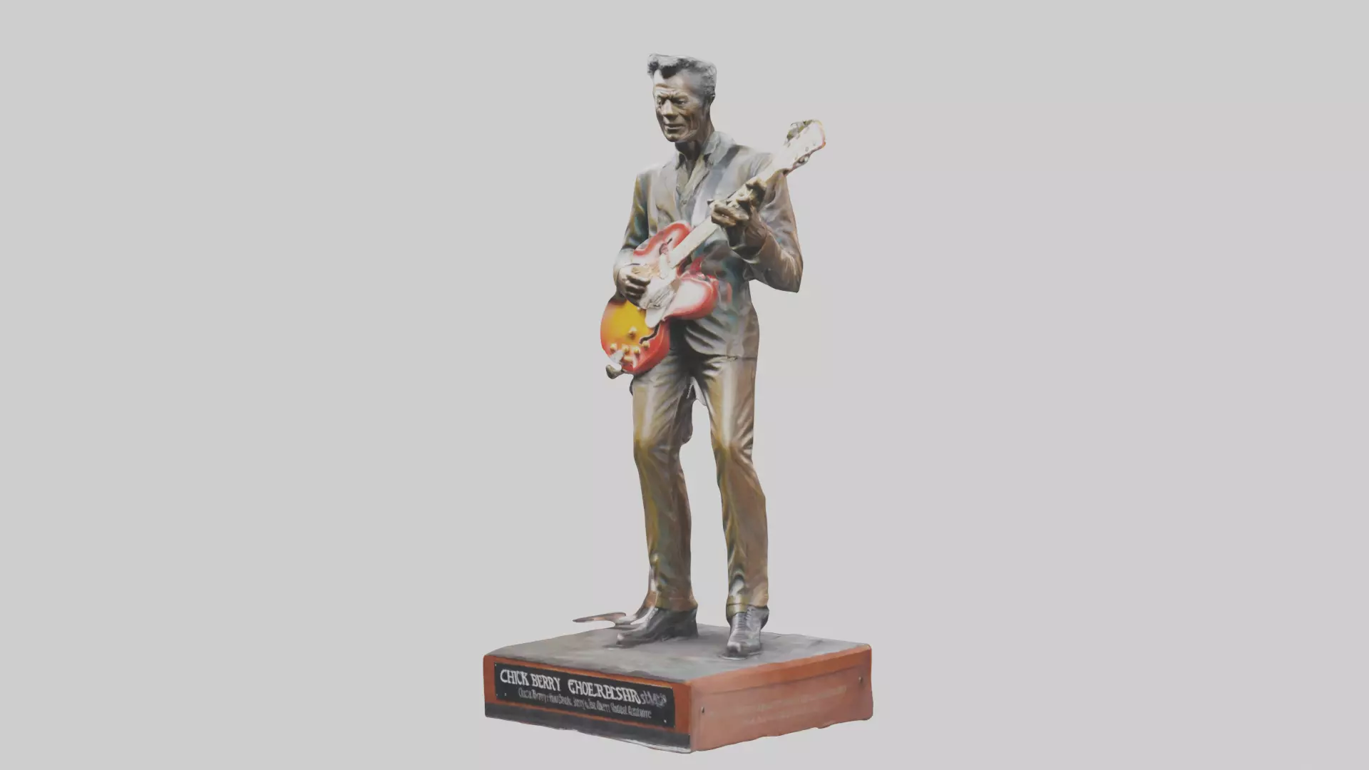 This detailed 3D model of a Chuck Berry Statue is perfect for music-themed visualizations, historical scenes, or artistic representations of this legendary musician. It accurately represents Chuck Berry's iconic stance and energy. Available in FBX, OBJ, STL, GLB, USDZ, and BLEND formats.