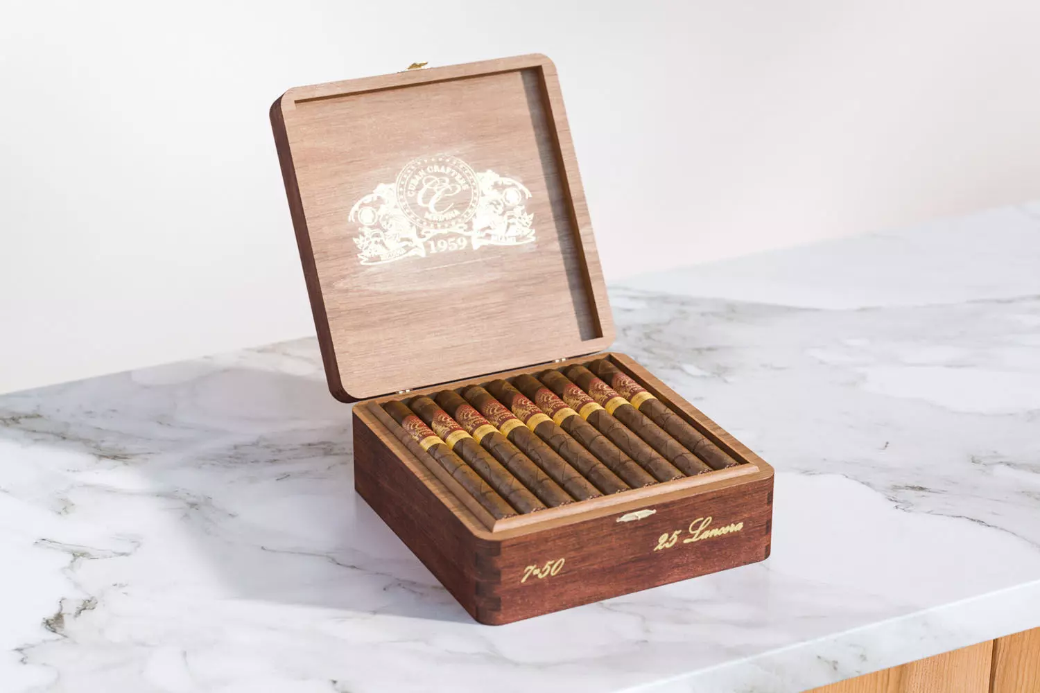 The high quality 3D model includes cigar box in classic wooden packaging closed with a metal latch. Cigars stacked side by side inside.