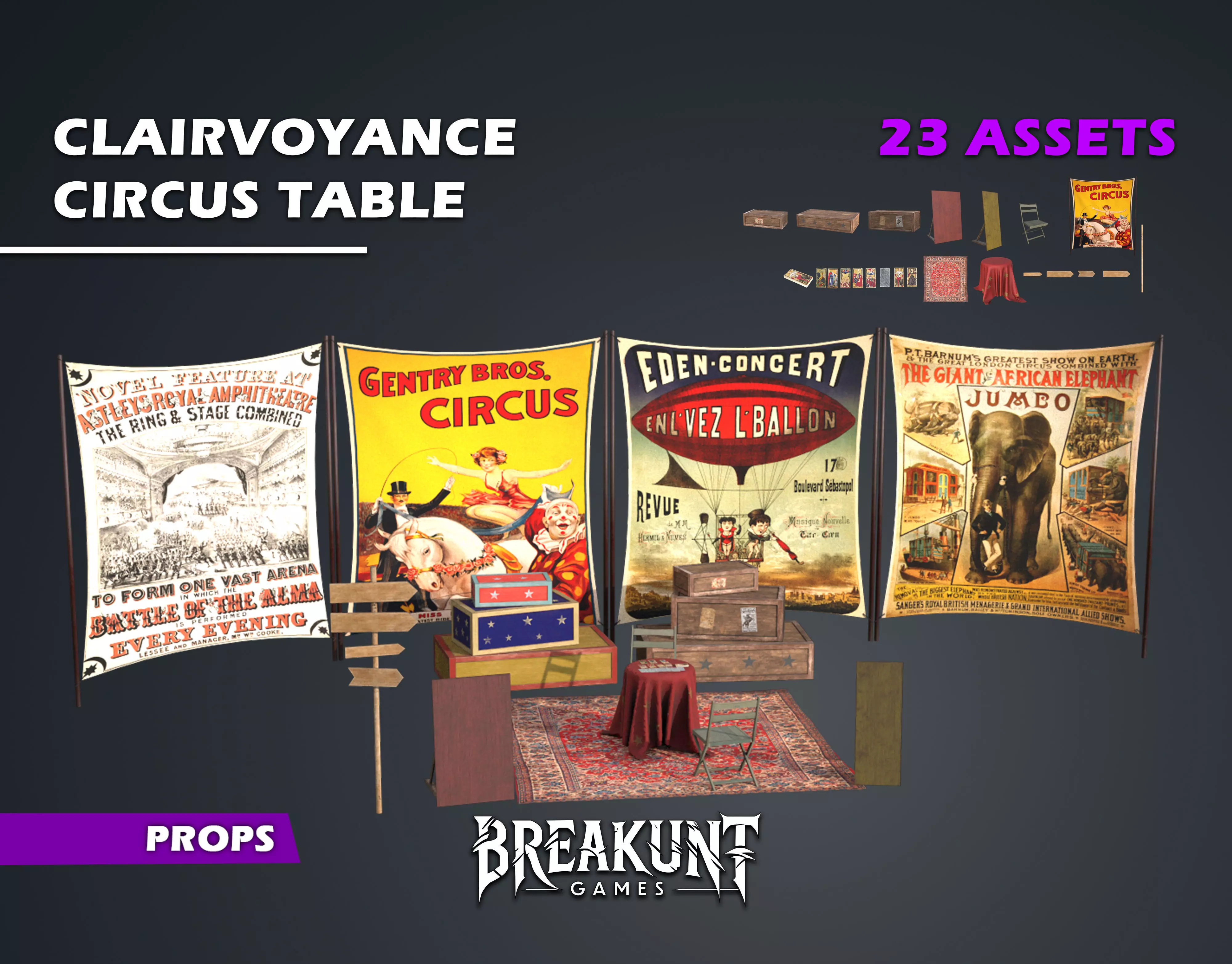 Step right up and discover the Clairvoyance Circus Table Pack! This realistic, game-ready assetcollection brings the atmosphere of a mysterious fortune-teller's circus stand to life. Featuring avintage table with cloth, wooden crates, decorative circus posters, chairs, direction signs,and a luxurious vintage carpet, this pack is perfect for circus environments, carnivals,festivals, and even horror circus settings. It includes a full set of tarot cards (1 front and 7 backvariations plus a card box) for immersive gameplay.