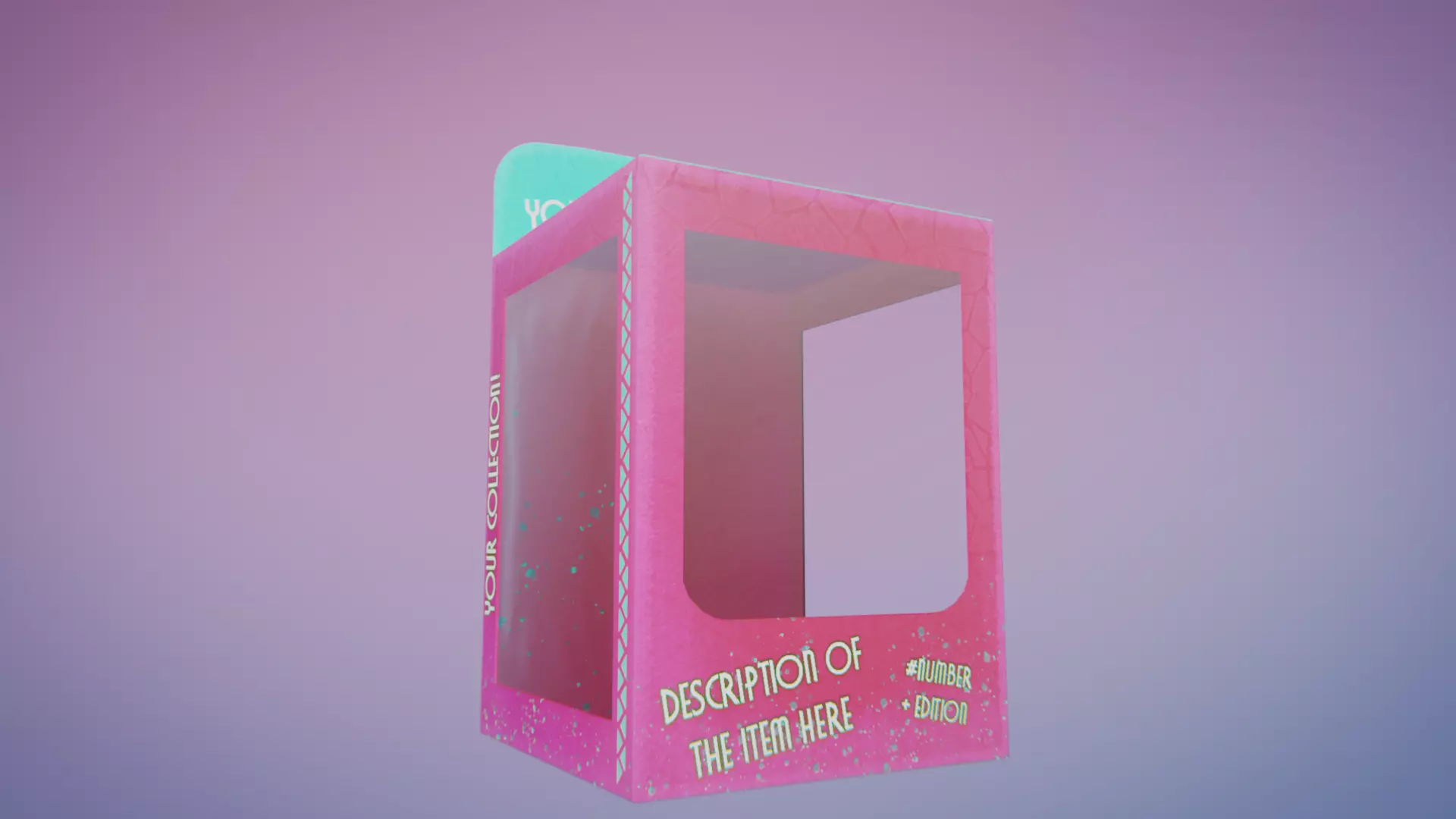 Create your own NFT collectible faster:This is a complete 3D set displaying a turntable collectible box, for anyone who'd like to gain some time in making their own NFT. You can now focus on really creating the object you want to display in this box without wasting too much energy in the boring steps of modeling, UVs and lighting.