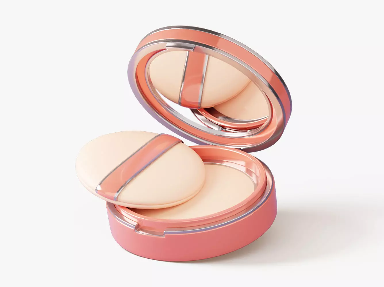 A chic compact powder case in soft coral, shown open with a built-in mirror and a plush round puff resting on the rim. The pressed powder pan sits snugly inside the glossy case, giving a clean, feminine look that suits beauty banners, ecommerce thumbnails, app UI icons, packaging mockups, and tutorial graphics. Minimal studio lighting and a white backdrop keep the shapes readable and the product the clear hero for any cosmetics-themed design.