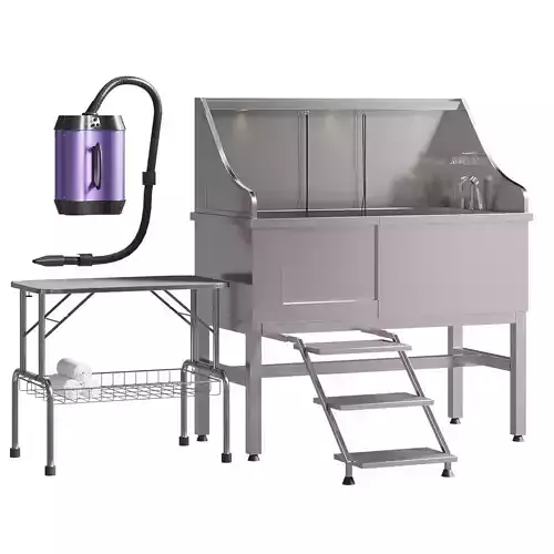The set is designed for continuous workflow: convenient access to the bath, safe placement of the pet, and quick drying without overloading the space.Suitable for visualizations of grooming salons, pet spa areas, and specialized interiors.