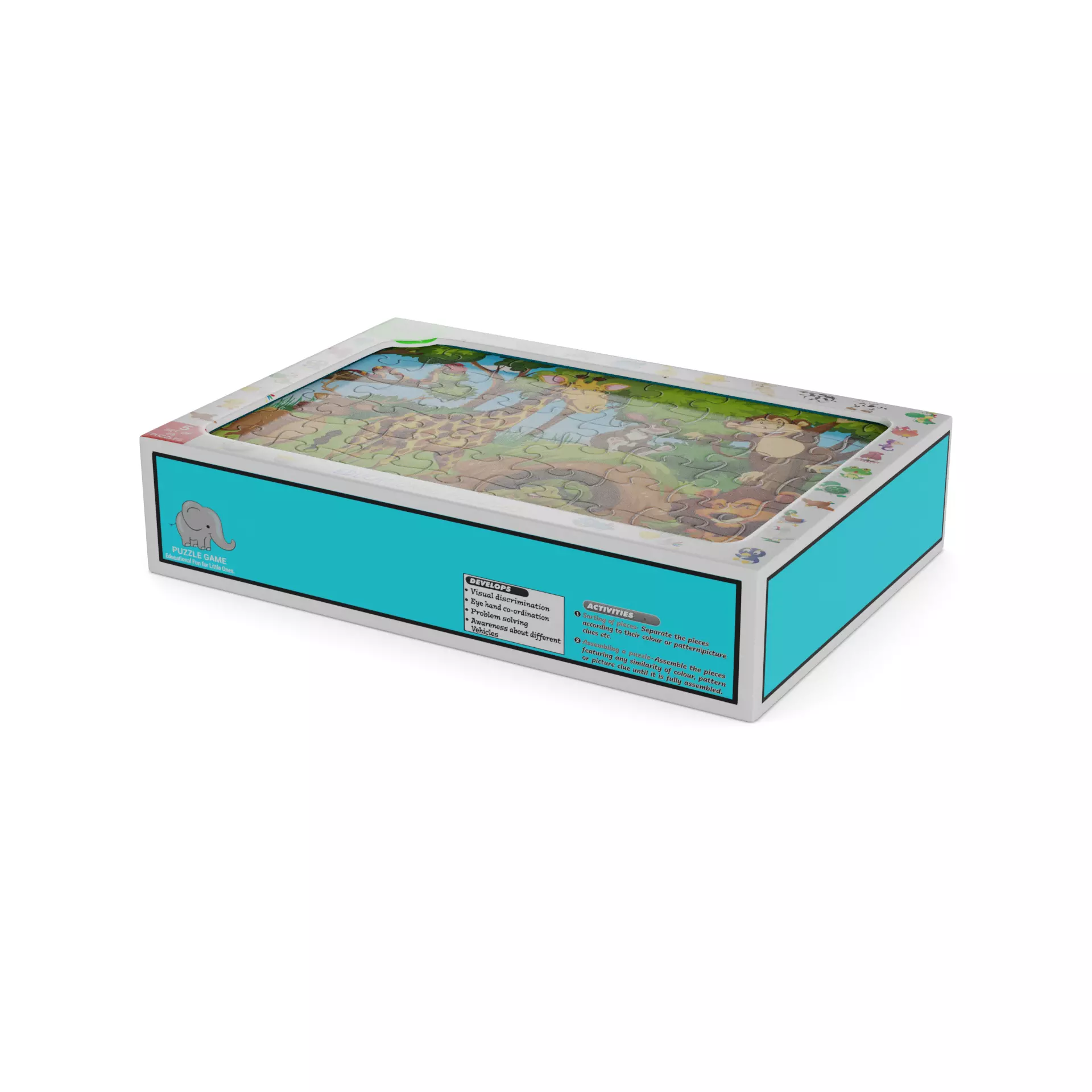 Playful Puzzles: A set of colorful, interactive puzzles designed to stimulate your child's problem-solving skills. Each puzzle piece is made of sturdy cardboard, featuring vibrant illustrations of animals, numbers, and shapes. The packaging is a compact, rectangular box with a clear plastic window, allowing you to see the puzzle pieces inside. The box is adorned with a playful graphic of a smiling child, and includes a label that says Educational Fun for Little Ones.