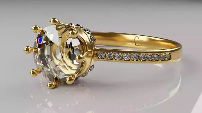 Model of a golden ring with a big diamond in the center, held by a crown.It's designed for highly detailed renders, marketing and to be used as a prop.For the native Blend file, I used a node based material for the diamonds, making them more shiny and colorful. For other file types, you're gonna need to edit it, using defraction to get the material looking like that.