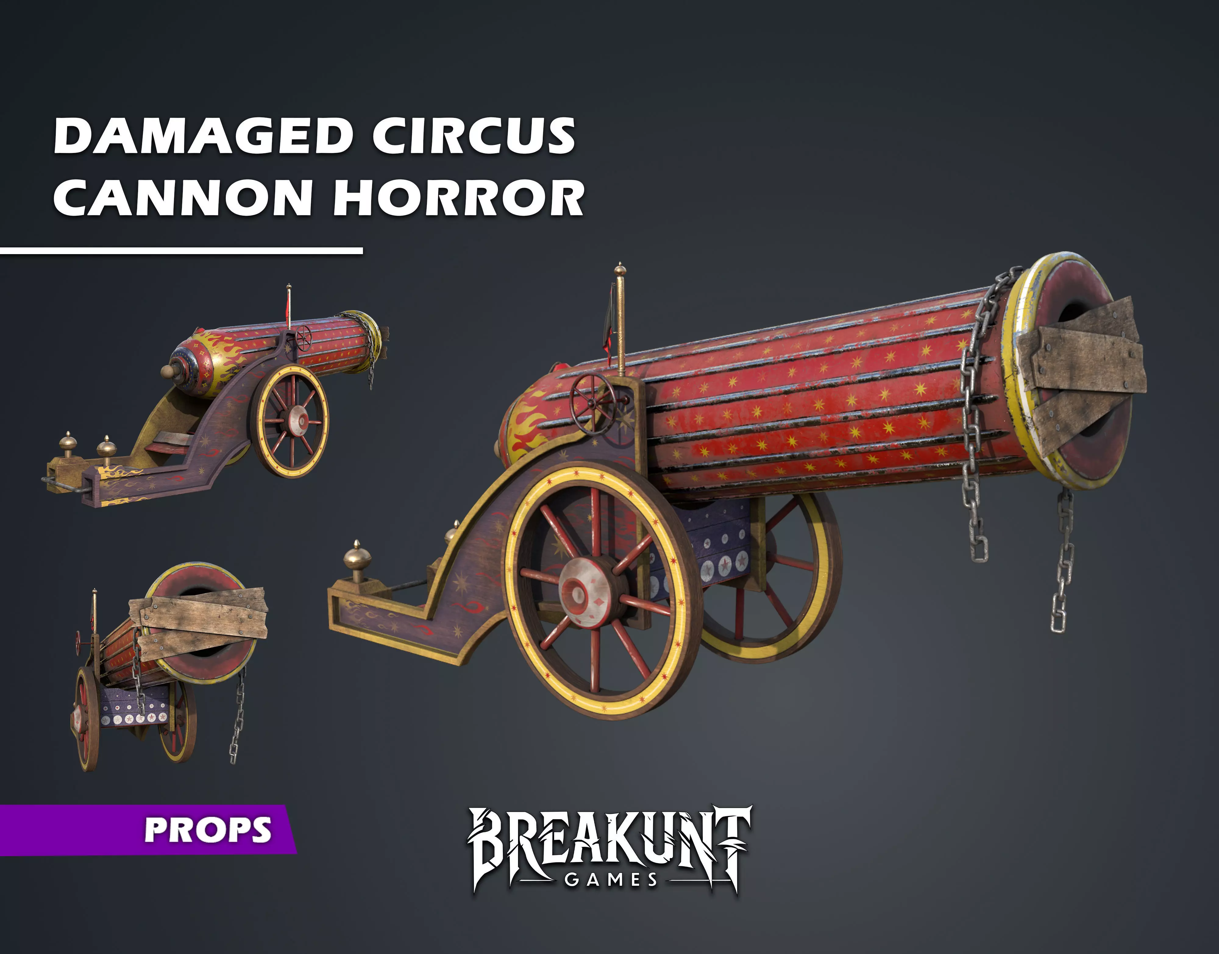 Tags :circus, cannon, damaged, broken, carnival, horror, prop, game-ready, pbr, whimsical, fantasy,wooden, metallic, chains, unreal engine, ue5, environment prop, decoration, fairground, old, asset, toy cannon
