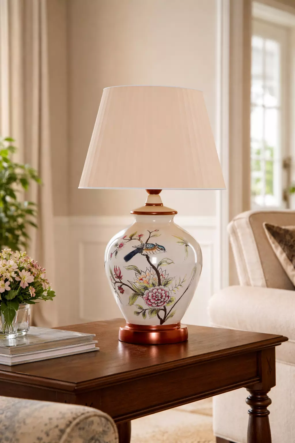 A high-quality 3D model of a decorative ceramic table lamp featuring a detailed floral and bird pattern on a smooth glazed base, paired with a classic fabric lampshade. Designed with realistic proportions and materials, this model is ideal for interior visualization, architectural renders, product showcases, and decorative scene setups.