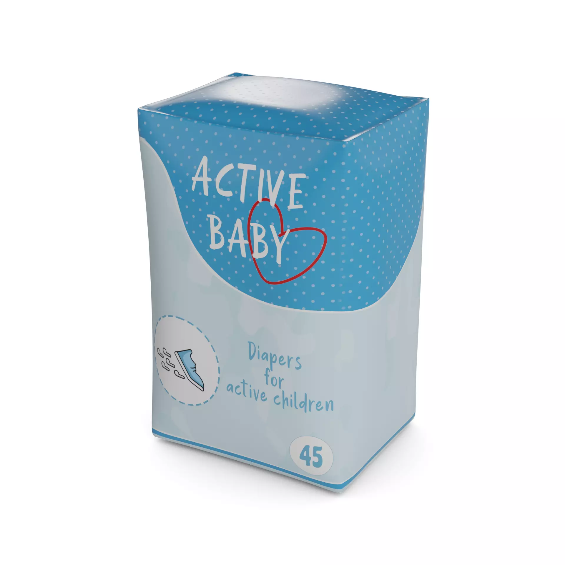 Diapers: This pack of diapers is perfect for active babies on the move. The packaging features a sporty design with vibrant colors. The diapers have a flexible fit and are designed to move with your baby. The pack contains 45 diapers and includes a label with the text Active Baby and a graphic of a running shoe.